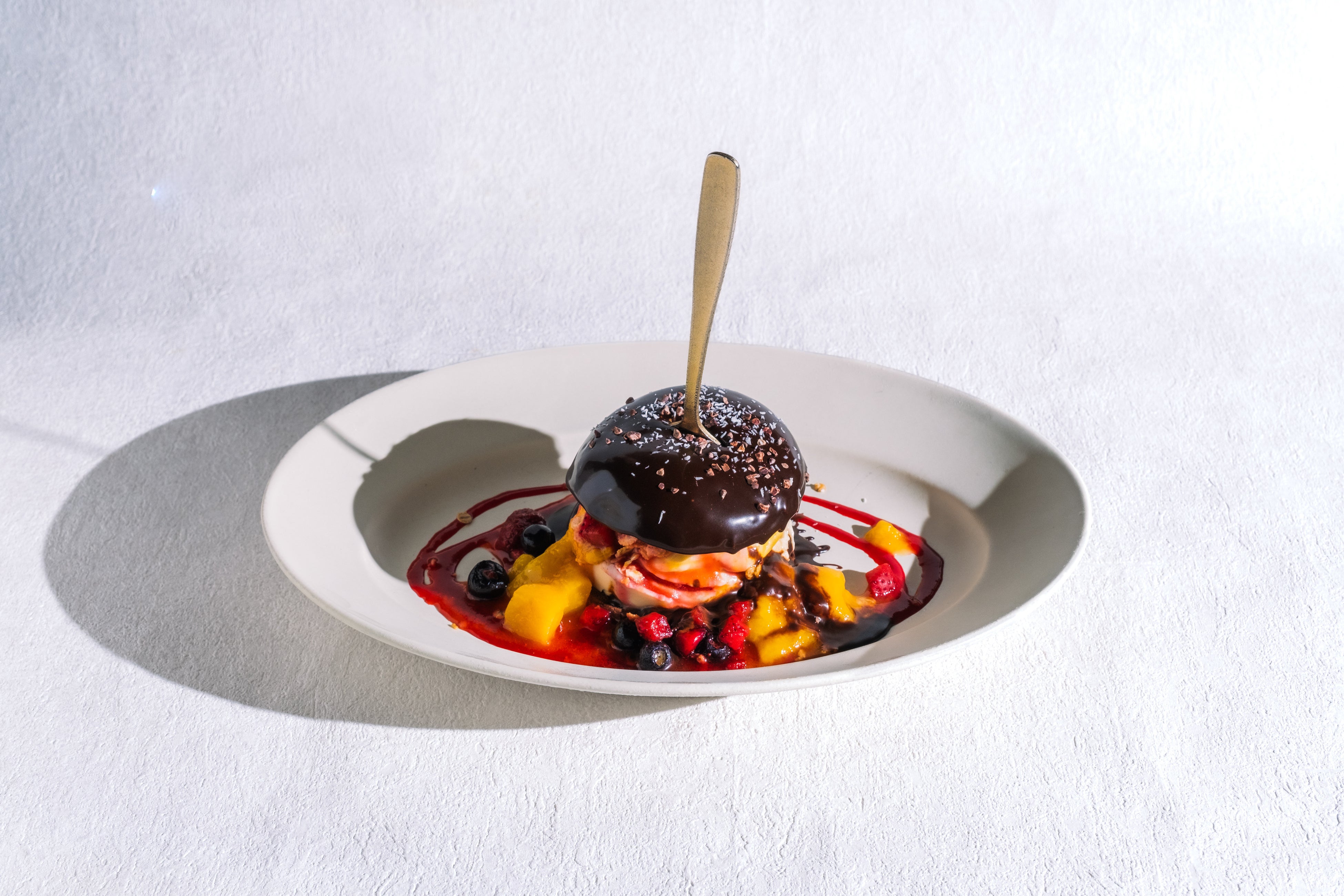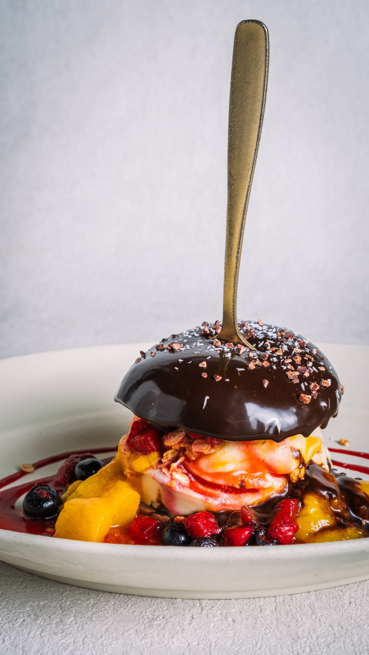 上からデーツチョコソースをおしみなくかけ、カカオニブとココナツファインをちりばめました。