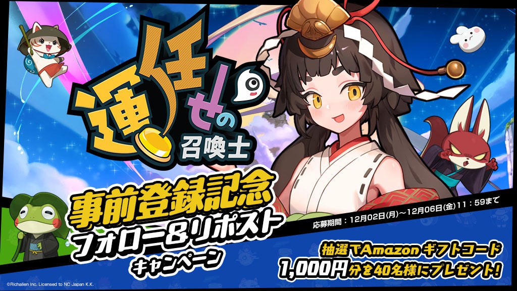 「運任せの召喚士」の事前登録開始を記念して、抽選でAmazonギフトカード1,000円分が当たる「事前登録開始記念 フォロー&リポストCP」を開催します。
