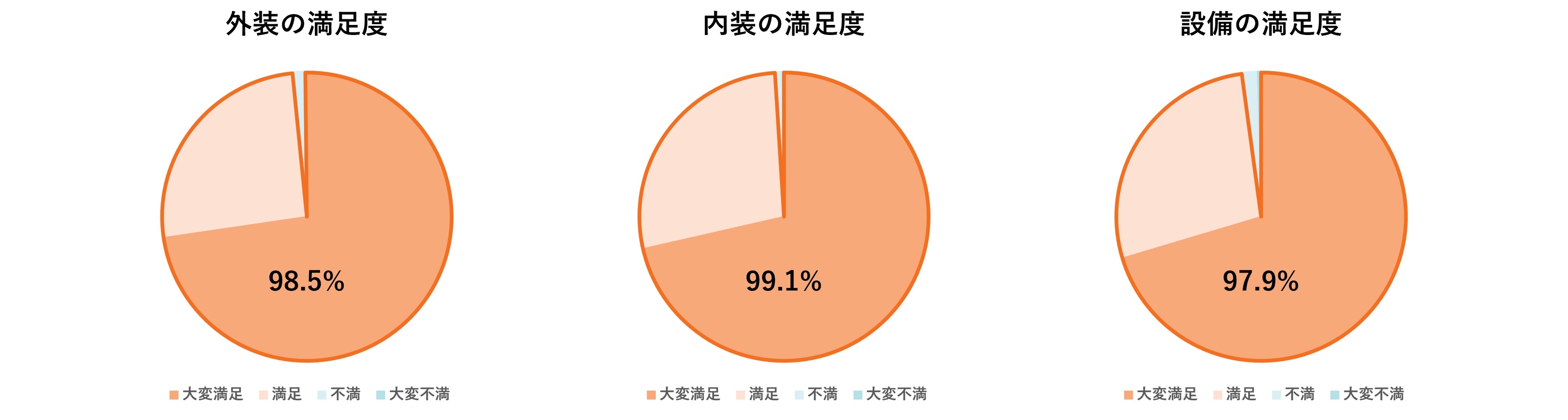 外装・内装・住宅設備をパッケージとして提案している点についても、「大変満足」「満足」を合わせた評価は、外装で 98.5%、内装で 99.1%、住宅設備で 97.9% と、いずれも90%台後半の高い水準となりました。