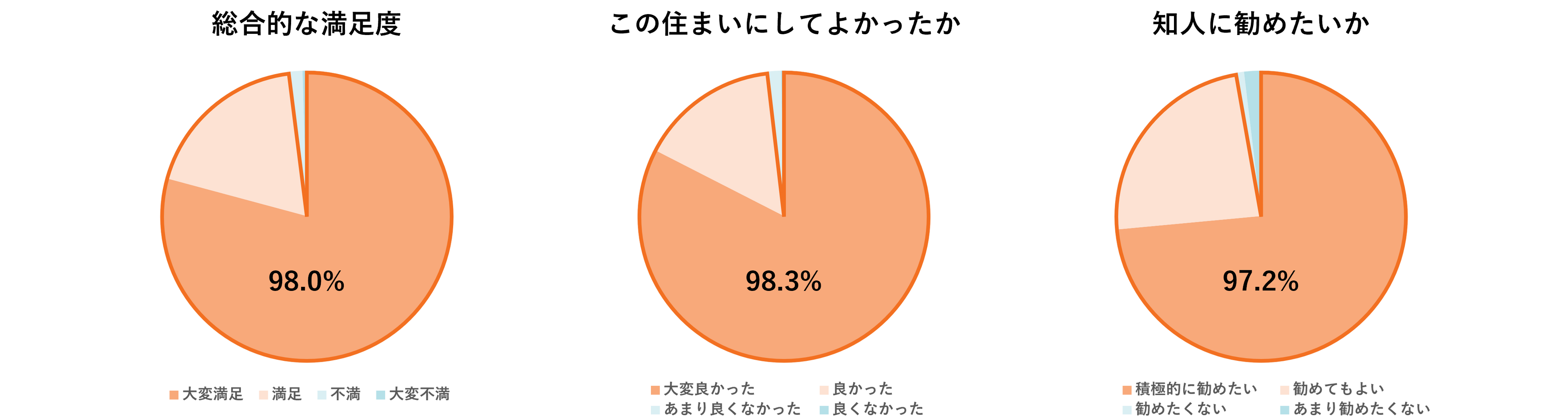 また、実施した入居後1か月アンケートでは、「Smart Made Housing.」が規格住宅・セミオーダー住宅でありながら、自由設計と比較しても高い満足度の評価をいただいており、約98%のオーナー様が「満足」と回答しています。