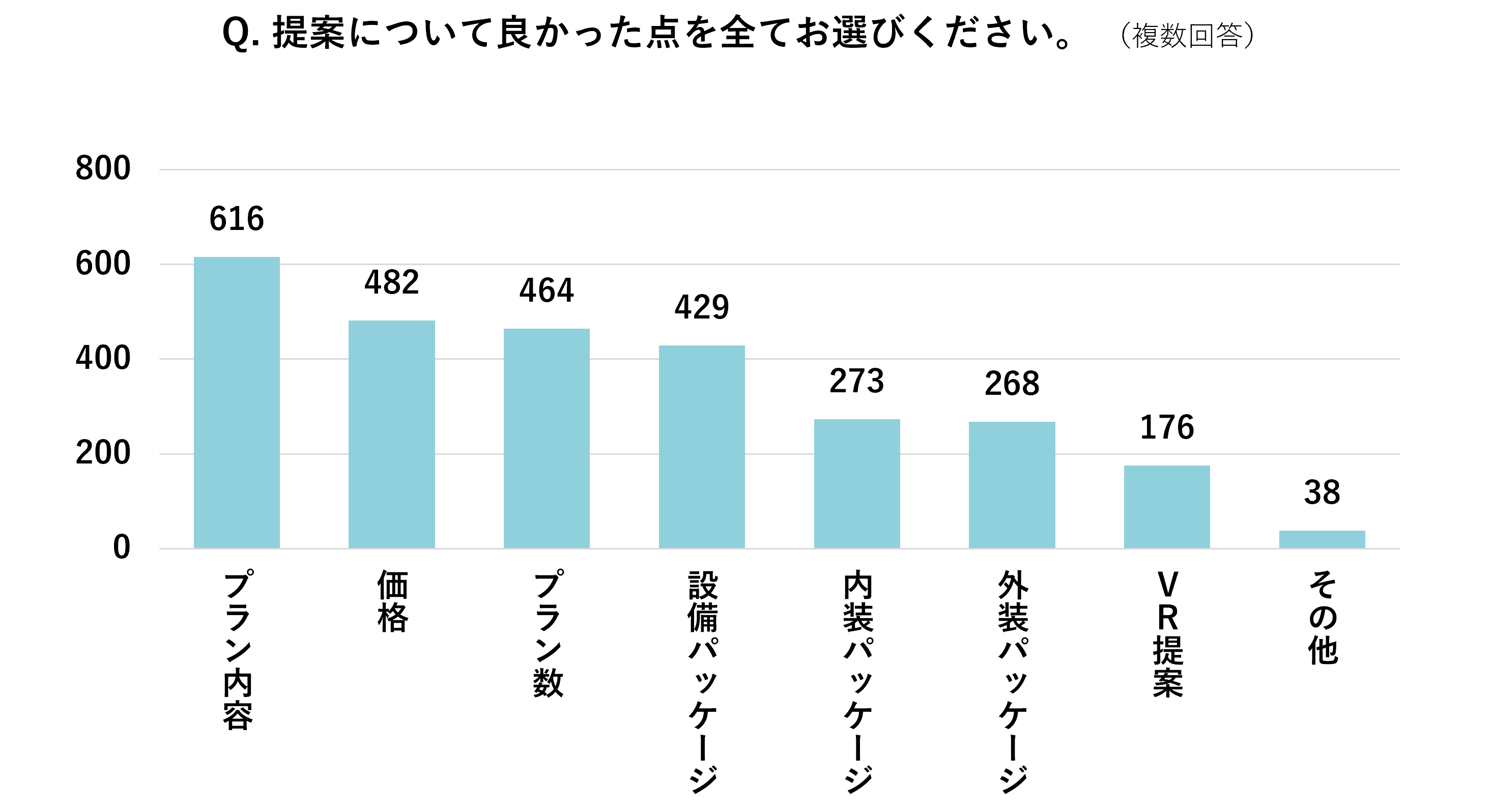Smart Made Housing. の提案で良かった点を尋ねたところ、最も多く挙げられたのは 「プラン内容(間取り)」でした。プラン数や価格の分かりやすさ、VR提案といった項目も評価されていますが、なかでも暮らしやすさを具体的に想像できる間取りそのものへの評価が際立つ結果となっています。