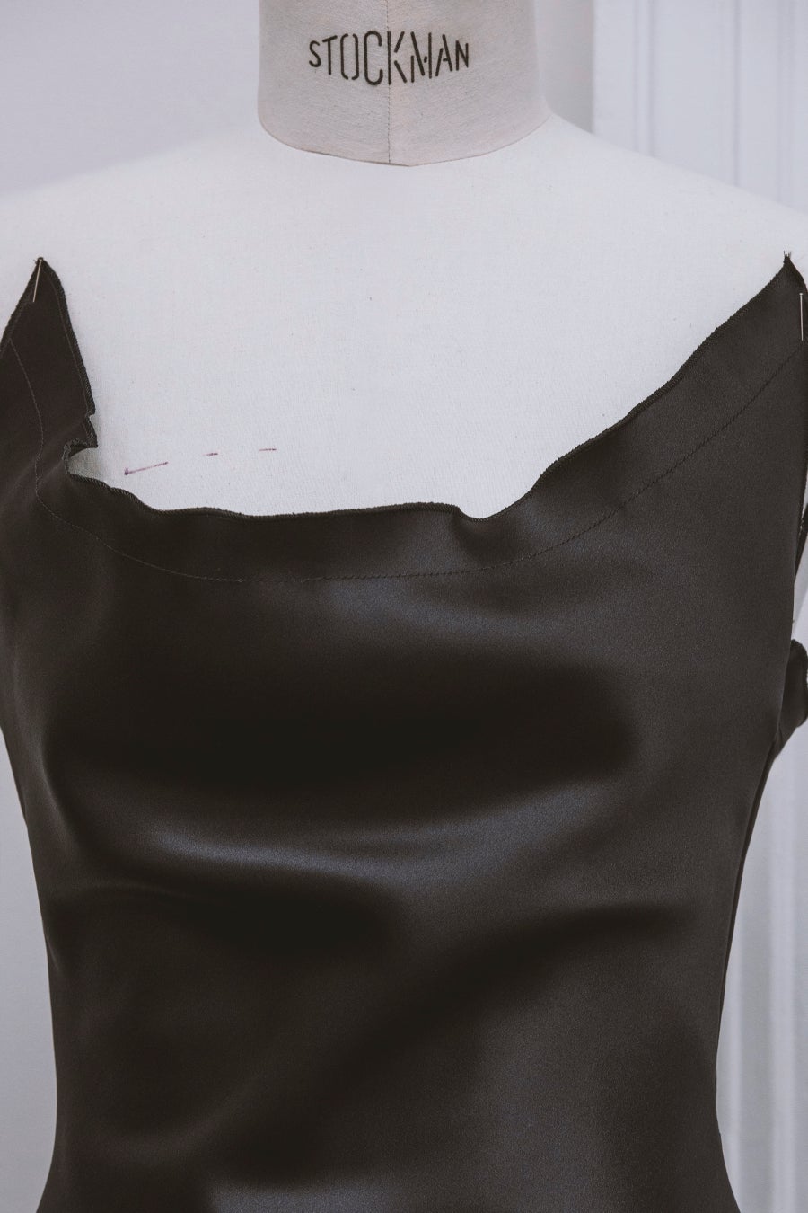 ミア・ゴスはネックラインに刺繍が施されたブラックサテンドレスと、ディオール ファイン ジュエリーを着用しました。