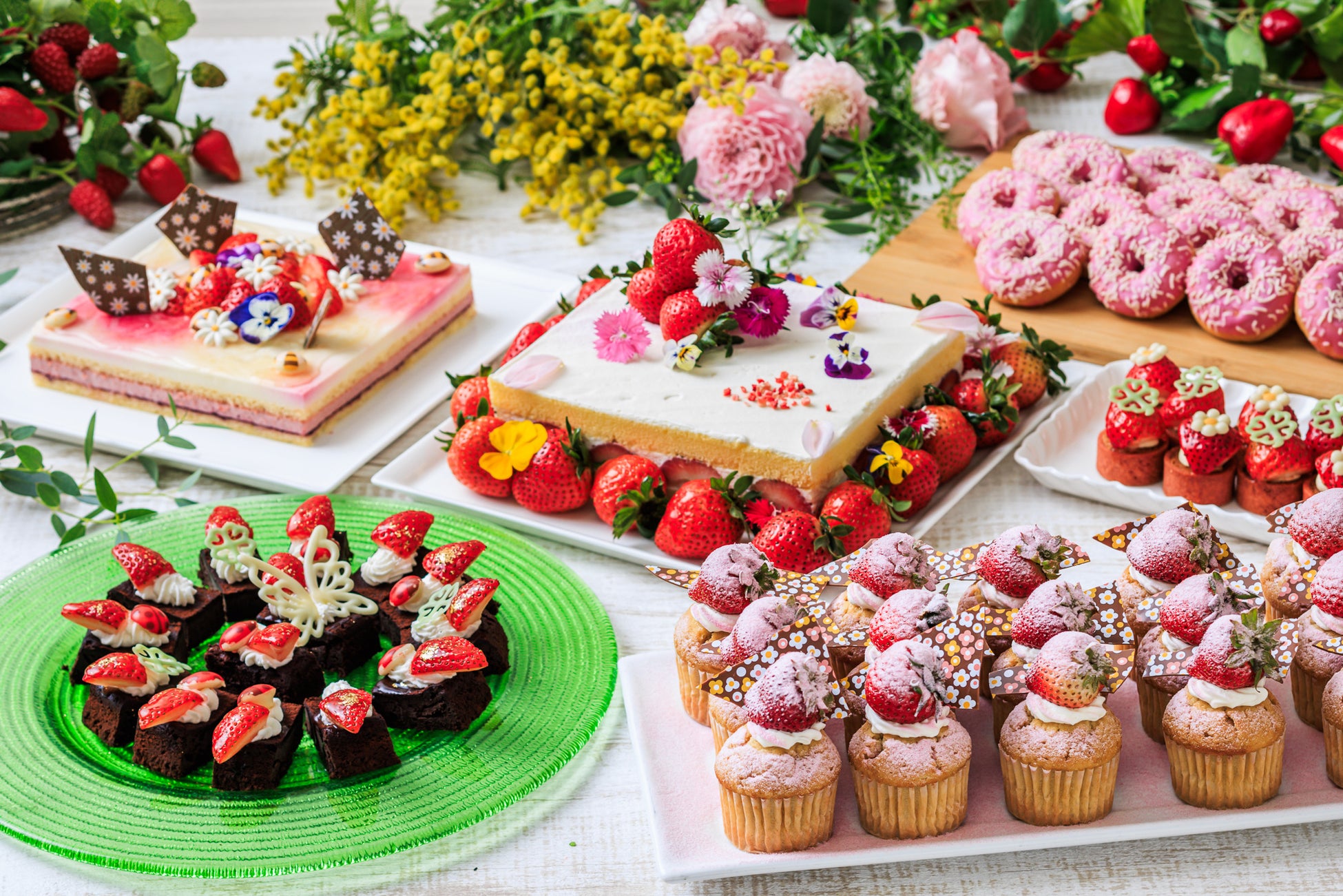 今年のスイーツブッフェは、「花が咲き誇る春の庭」をイメージし、いちごをたっぷり使用したスイーツに、エディブルフラワーなどを散りばめた色とりどりのスイーツが会場を華やかに彩ります。