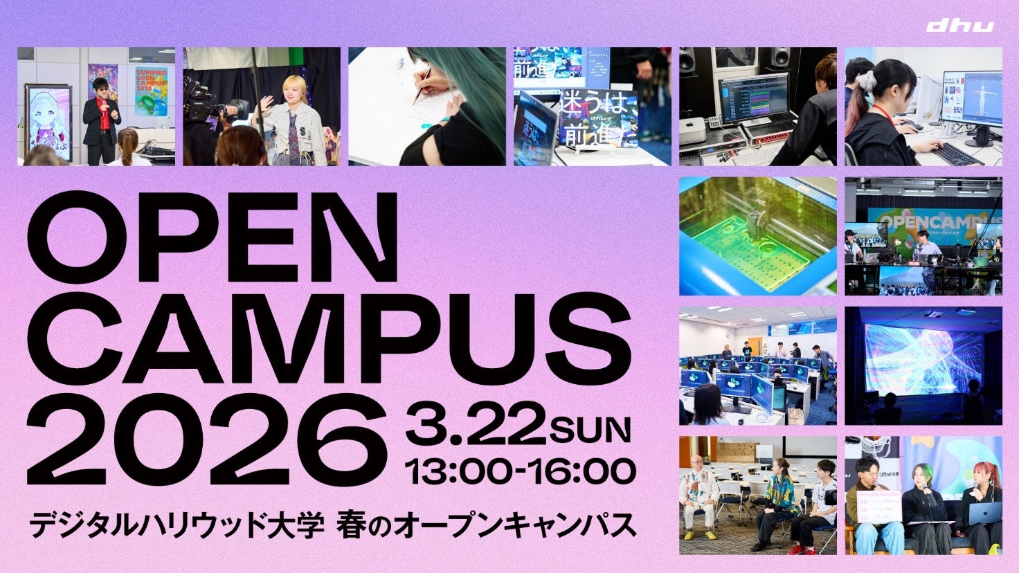 文部科学省認可の株式会社立の大学として、デジタルコンテンツと企画・コミュニケーションを学ぶデジタルコミュニケーション学部(4年制大学)と、理論と実務を架橋し新たなビジネスを生み出すデジタルコンテンツ研究科(専門職大学院)を設置するデジタルハリウッド大学(DHU、所在地:東京・御茶ノ水、学長:杉山知之)では、2026年3月22日(日)に「春のオープンキャンパス2026」を開催します。