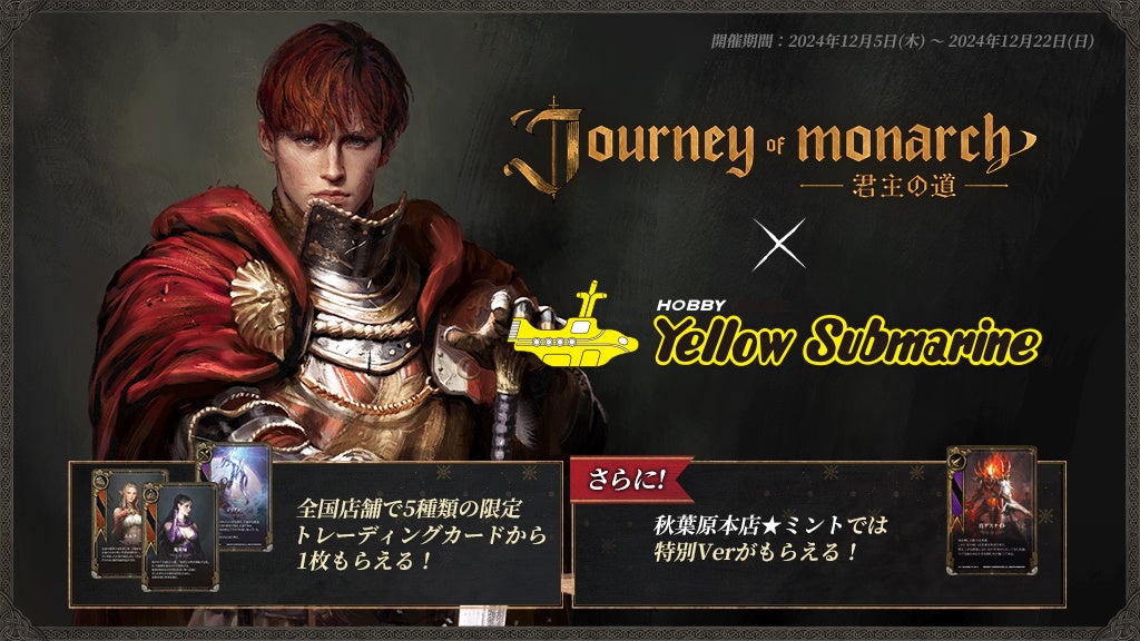 「イエローサブマリン」店舗にてお買い物をされた方に、「Journey of Monarch - 君主の道」限定トレーディングカードのプレゼントを実施するほか、ここでしか見れないコラボポスターの掲示などを実施します。