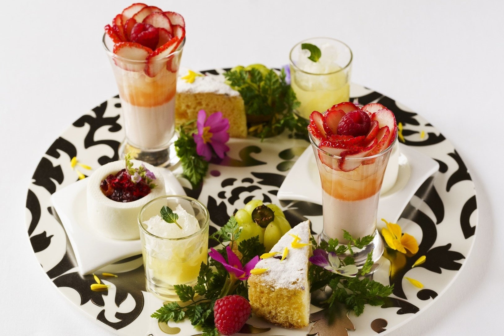 大輪の花をイメージした「桃のプリン」、ピリッとした花椒がアクセントの「ブドウのタルト」、ラベンダー風味のグリオットチェリーソースと楽しむ「フロマージュムース」など、華やかなスイーツをお楽しみください。