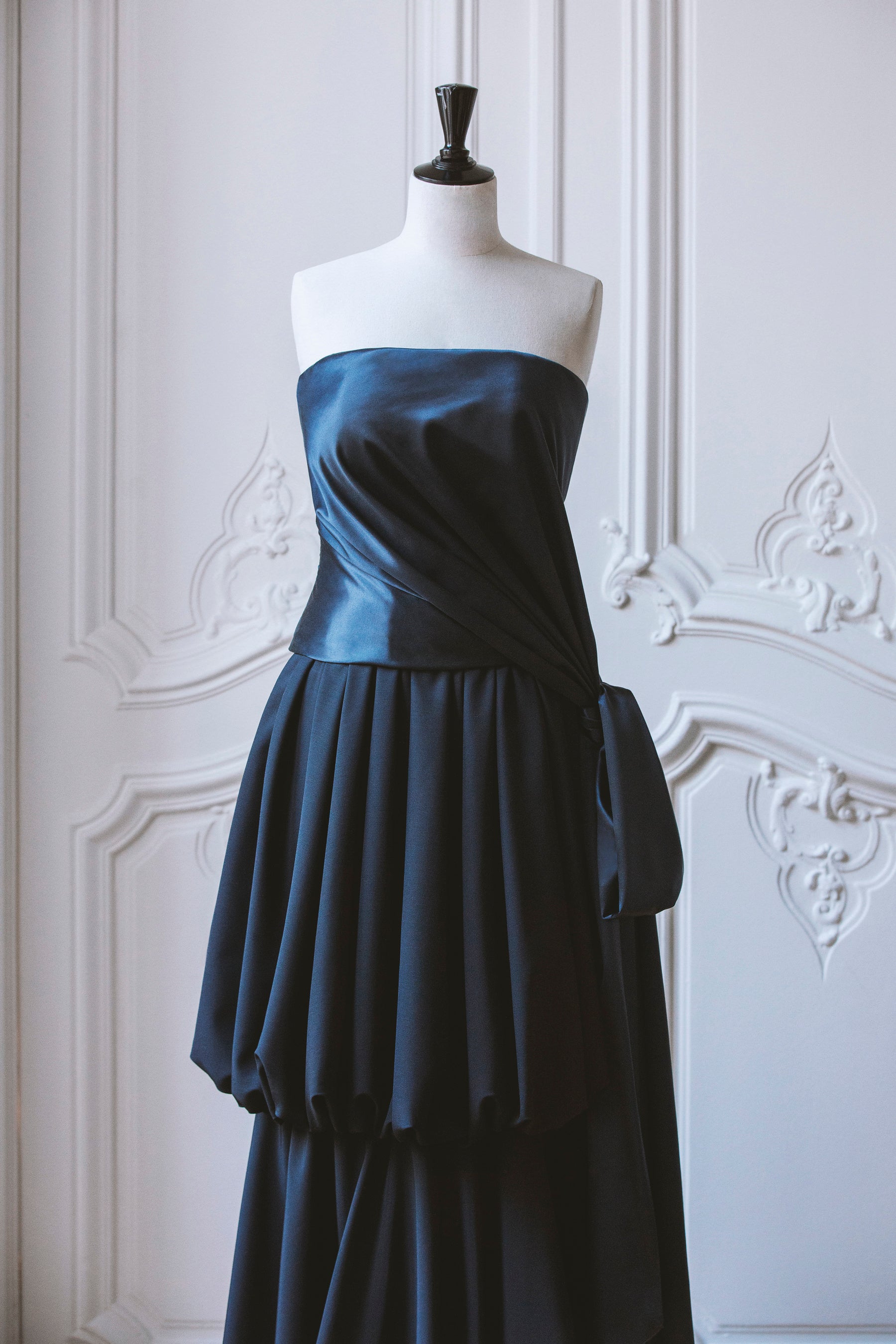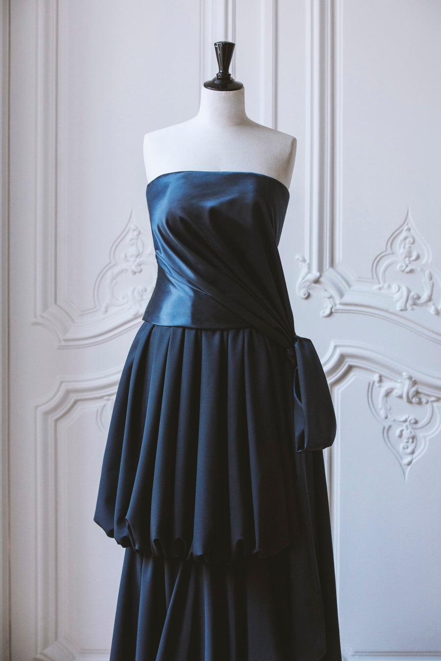 プリヤンカ・チョープラー=ジョナスは、ネイビーサテンのドレープバストイヤーとネイビーシルクスカートを合わせた装いで登場しました。