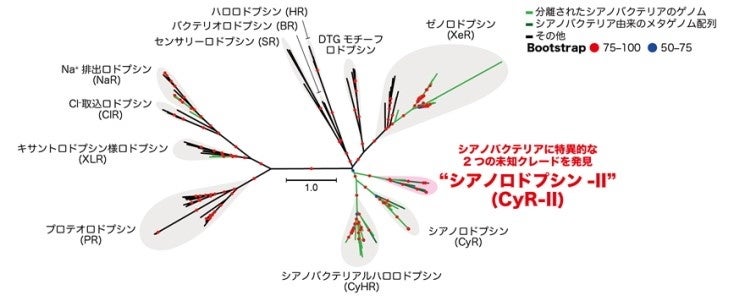 しかしながら、「シアノバクテリアのロドプシンが利用できる光は緑色のみなのか?」「海洋のシアノバクテリアは本当にロドプシンを持たないのか?」といった、シアノバクテリアが持つロドプシンの多様性についてはよくわかっていませんでした。こうした背景の中、今回、私たちのグループは、様々な環境から得られたメタゲノム情報を対象に、シアノバクテリアが持つロドプシン遺伝子の探索を行いました。その結果、シアノバクテリアのみが持つ新たなロドプシングループを発見し、「シアノロドプシン-II(CyR-II)」と名付けました。