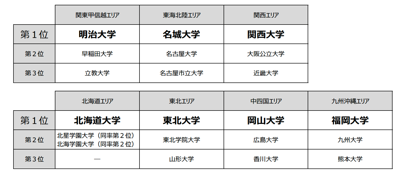 今年度の調査では全国を7エリア(関東甲信越、東海北陸、関西、北海道、東北、中四国、九州沖縄)に分けて聴取しました。その結果、各エリアで志願されている大学の上位は以下の通りとなりました。