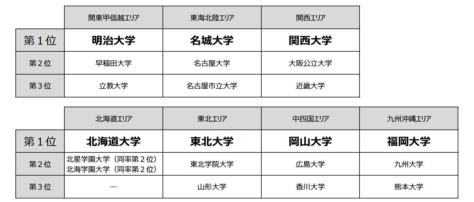 エリアごとでは、関東甲信越、関西ではエリア内の大学が上位20校を占めました。一方で東北、中四国では半数近くが他エリアの大学となっており、エリア外への志願度に差がみられる結果となりました。