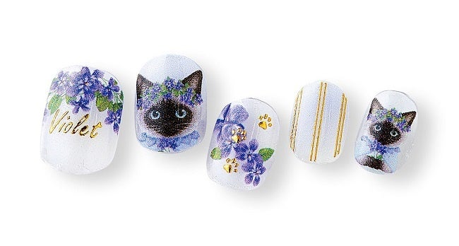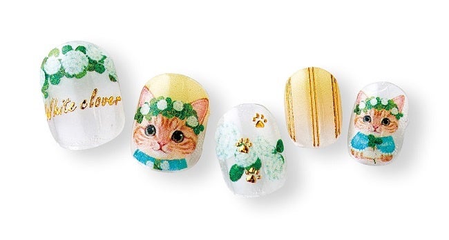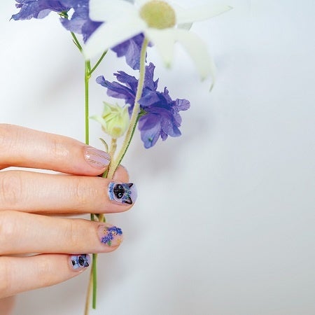 貼るだけで簡単に、お花の妖精猫さんのネイルアートが完成します。草花の中に小さな肉球があるのも猫好きさんにはうれしいポイントです。つめより少し小さめのシールを貼って、お手持ちのトップコートを塗れば、ぷっくりつやつやのジェル風ネイルの仕上がりが楽しめます。