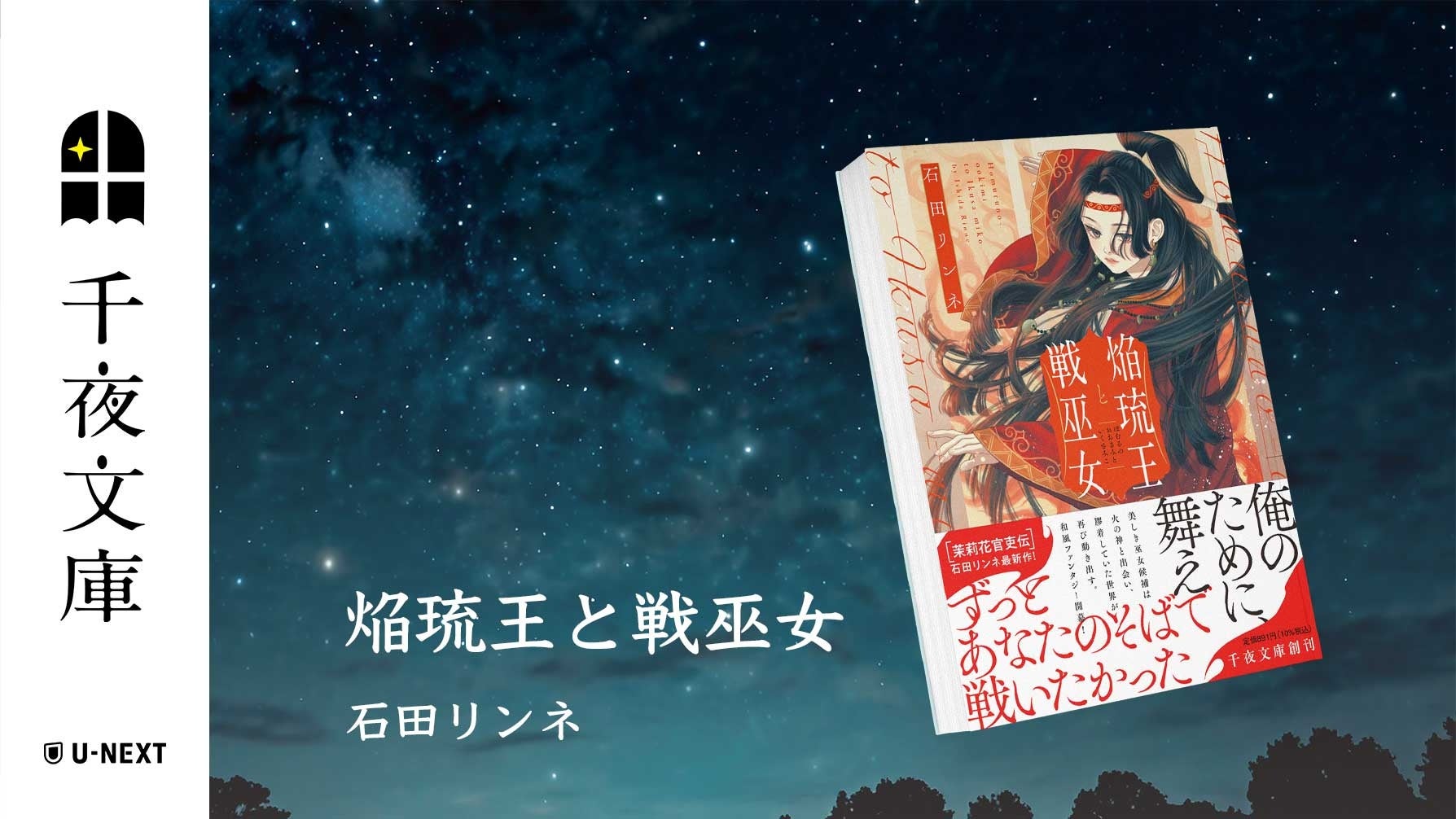 USEN&U-NEXT GROUPの株式会社U-NEXT(本社:東京都品川区、代表取締役社長:堤 天心)が運営する動画配信サービス「U-NEXT」は、石田リンネさんが手がけた和風ファンタジー小説『焔琉王と戦巫女』を3月3日(火)より全国の書店にて発売いたします。本書はU-NEXTの文庫レーベル「千夜文庫」の書き下ろし作品です。