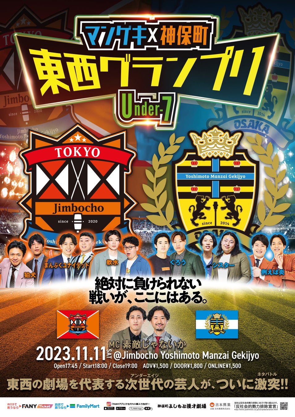 ⼤阪・難波にある「よしもと漫才劇場(通称マンゲキ)」と、東京・神保町にある「神保町よしもと漫才劇場」はこの度、神保町よしもと漫才劇場で2023年11⽉11⽇(土)に、「マンゲキ×神保町 東⻄グランプリ 〜Under-7〜」を開催いたします。