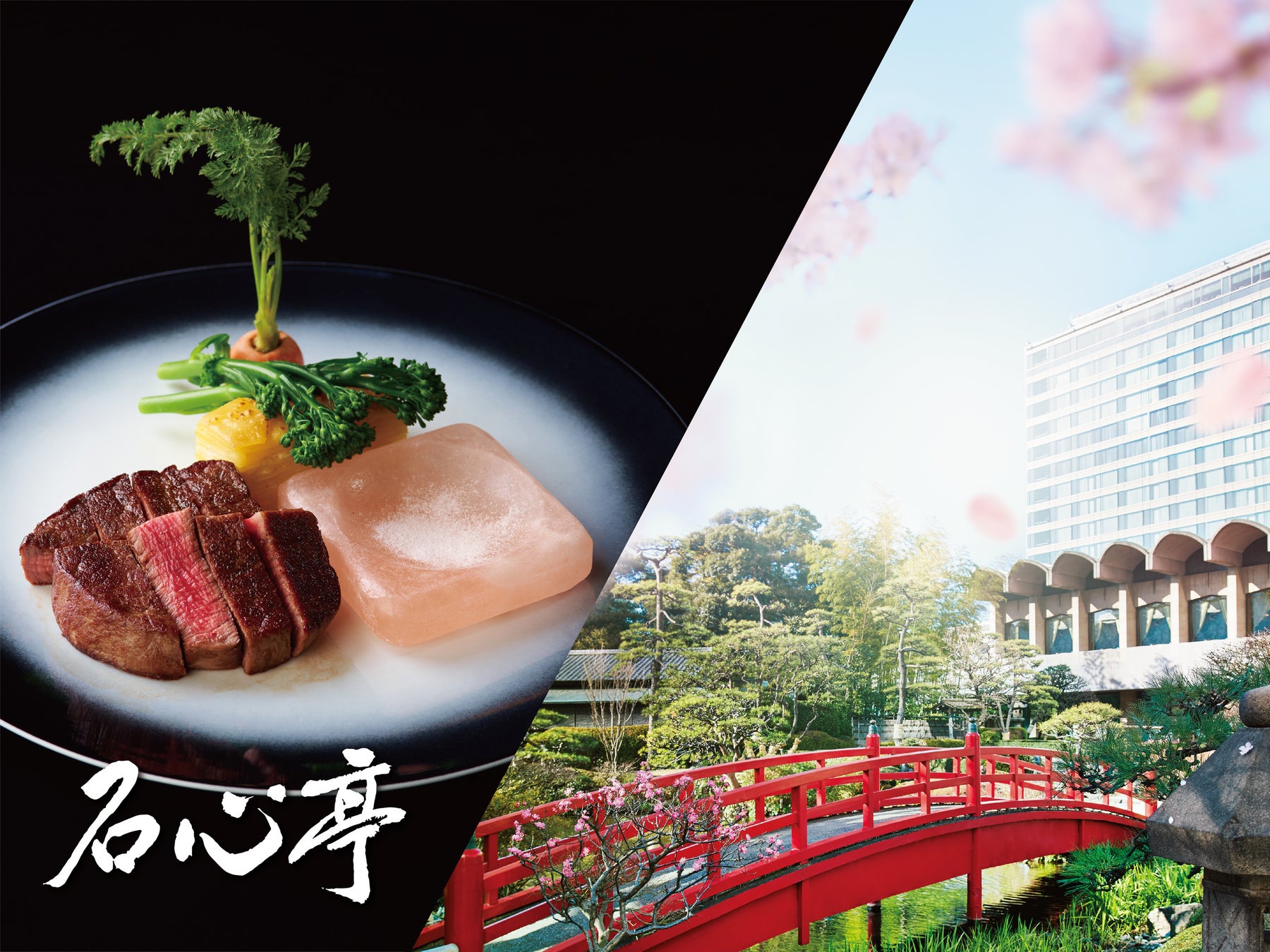 日没後には、今年9月に迎えるホテル開業60周年を記念した、1万坪の日本庭園を桜色にライトアップする『東京「夜桜」ライトアップ』も開催しております。日本庭園の中心に位置する鉄板焼レストランでのお食事を堪能した後は、お昼とはひと味違う、夜ならではの幻想的な日本庭園の散策をお愉しみください。