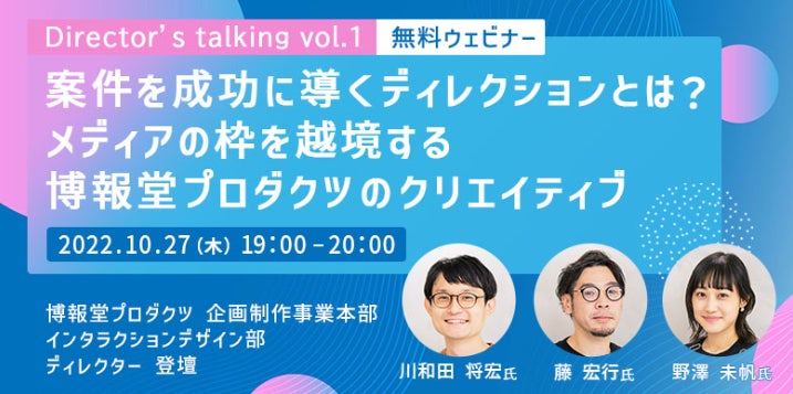 株式会社クリーク・アンド・リバー社(C&R社)は10月27日(木)、デジタル領域でディレクターとして活躍される方々を対象に無料のオンラインセミナー「Director's talking vol.1 案件を成功に導くディレクションとは? メディアの枠を越境する、博報堂プロダクツのクリエイティブ」を開催いたします。