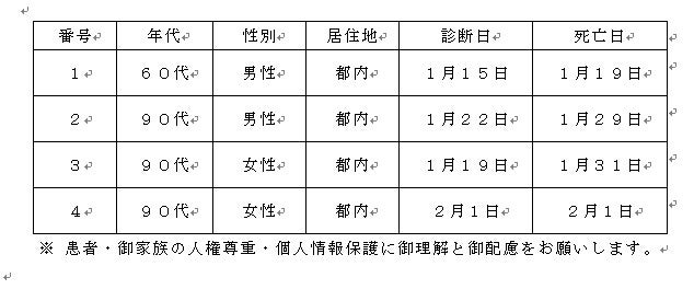 都内で新型コロナウイルスに感染した方が死亡されましたのでお知らせします。