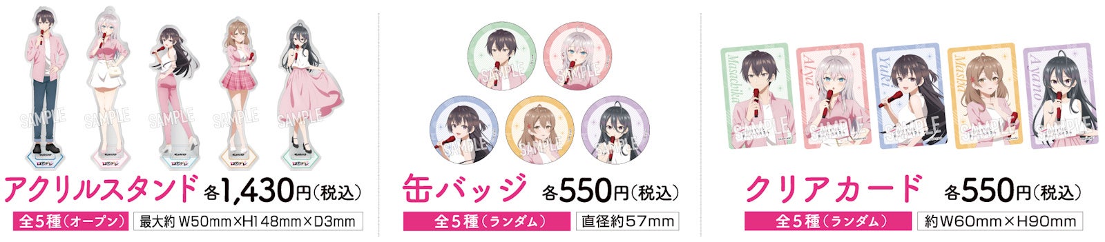さらに、描き下ろしイラストを使用したコラボキャンペーン限定のオリジナルグッズ、「アクリルスタンド【全5種/オープン】」「缶バッジ【全5種/ランダム】」「クリアカード【全5種/ランダム】」を、JOYSOUND直営店10店舗の店頭及び、オンラインストア(完全予約制)で販売いたします!
