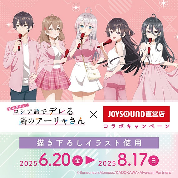 株式会社エクシングの子会社で、全国にカラオケ店舗・ネットカフェ店舗を展開する株式会社スタンダード(本社:東京都港区、代表取締役社長:小林克章)は、2025年6月20日(金)から2025年8月17日(日)までの期間中、「TVアニメ『時々ボソッとロシア語でデレる隣のアーリャさん』×JOYSOUND直営店コラボキャンペーン」と題し、JOYSOUND渋谷道玄坂店(東京)・JOYSOUND天王寺アポロ店(大阪)の2店舗にカラオケコラボルームをオープン!また、JOYSOUND直営店30店舗にて、オリジナルノベルティ付きコラボドリンクを展開します。さらに、一部店舗およびオンラインストアにて、オリジナルグッズの販売も行います。当コラボでは、ピンクと白のオリジナル衣装を着た描き下ろしイラストを使用いたします!