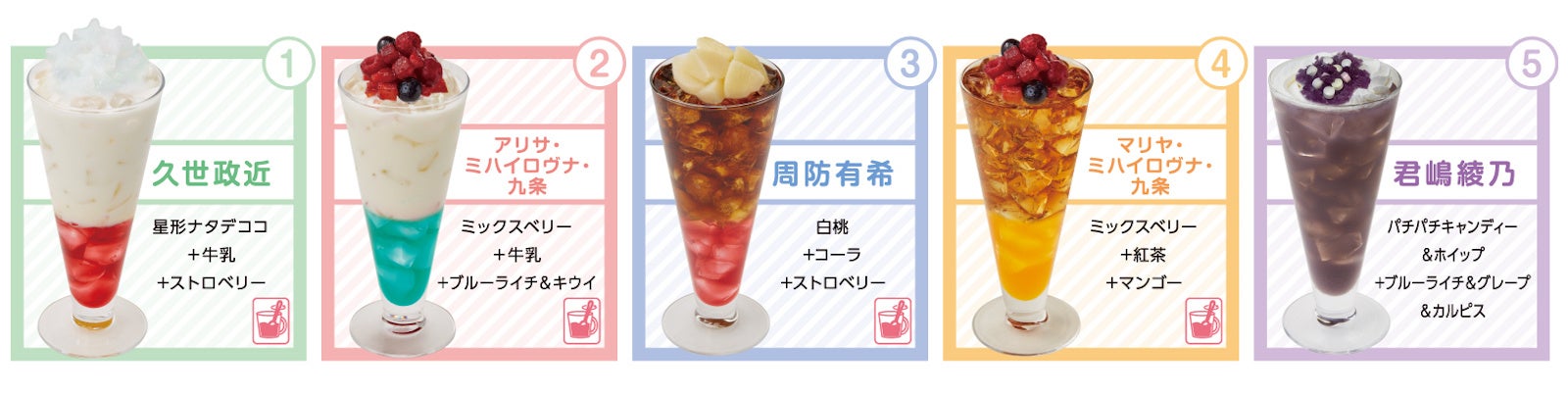 コラボドリンクは、「久世政近」「アリサ・ミハイロヴナ・九条」「周防有希」「マリヤ・ミハイロヴナ・九条」「君嶋綾乃」をイメージした全5種をご用意します。
