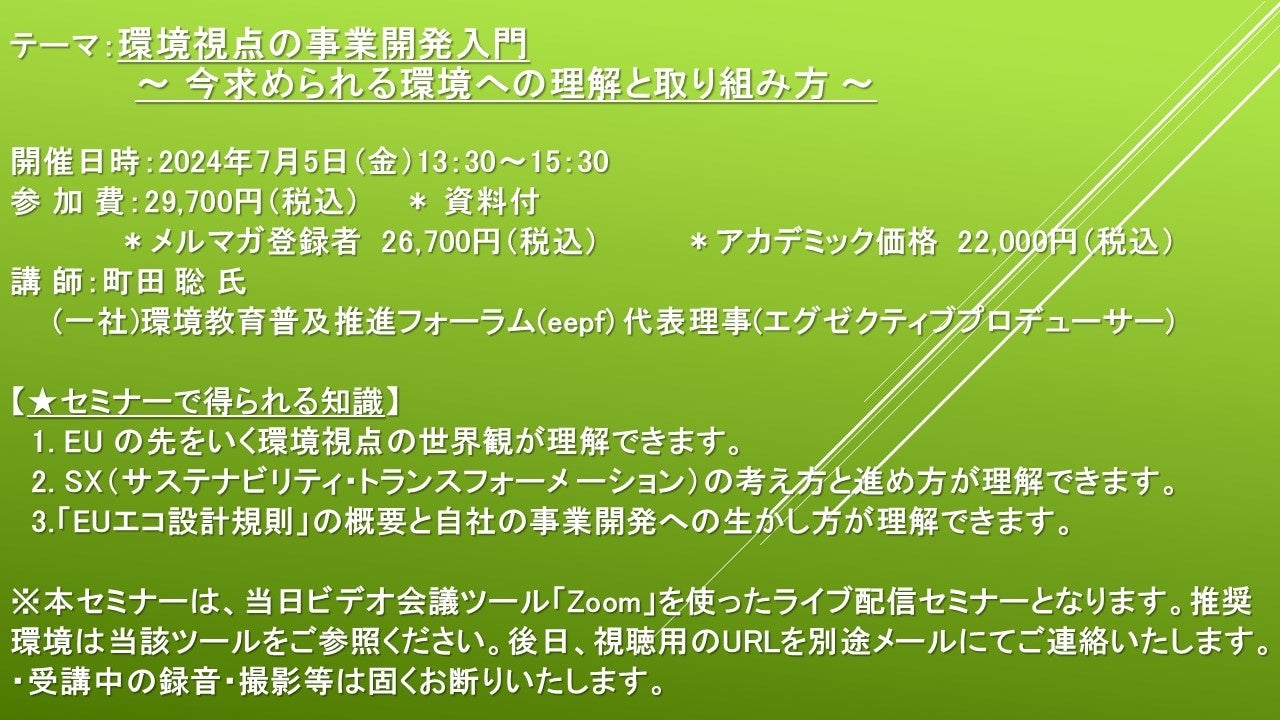 【ライブ配信セミナー】環境視点の事業開発入門 ~ 今求められる環境への理解と取り組み方 ~ 7月5日(金)開催 主催:(株)シーエムシー・リサーチ