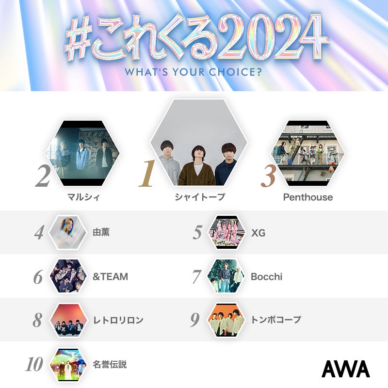 見事1位に輝いたのは、2023年4月にリリースされた「ランデヴー」がTikTokを中心にロングヒットを記録しているスリーピースバンドのシャイトープでした。AWAのプレイリスト採用楽曲ランキングでも2023年9月以降4カ月連続でトップ5にランクインを続けており、2024年の活躍に大注目が集まっているアーティストです。