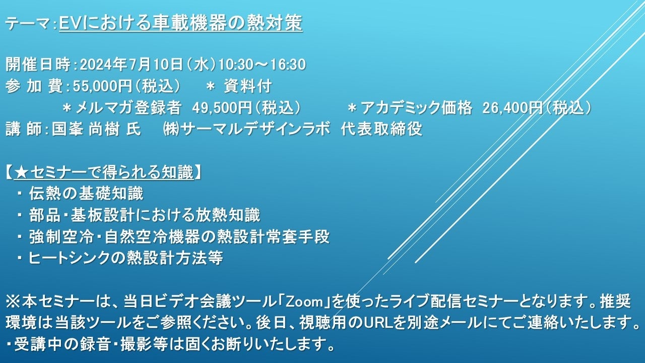 【ライブ配信セミナー】EVにおける車載機器の熱対策 7月10日(水)開催 主催:(株)シーエムシー・リサーチ