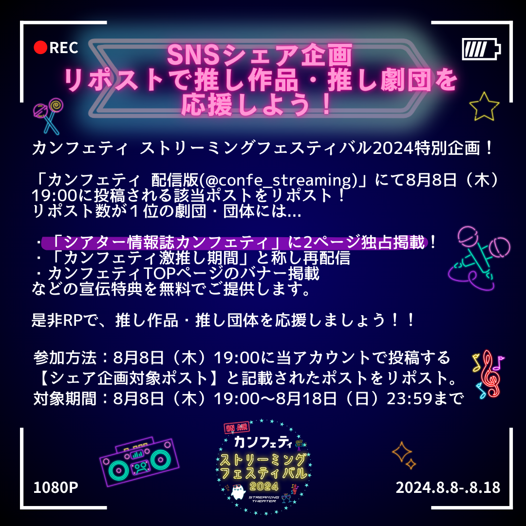 今回の「カンフェティストリーミングフェスティバル」では、配信期間中に投稿される対象ポストのリポスト数が1位の団体には、シアター情報誌カンフェティ見開き2ページ独占掲載の豪華特典がございます。