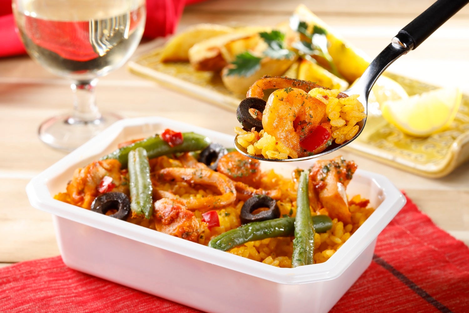 魚介の出汁で炊き上げたサフラン風味のご飯の上に、エビやイカ、チョリソー、オリーブなどを賑やかに配置し、本格的なパエリアに仕上げています。