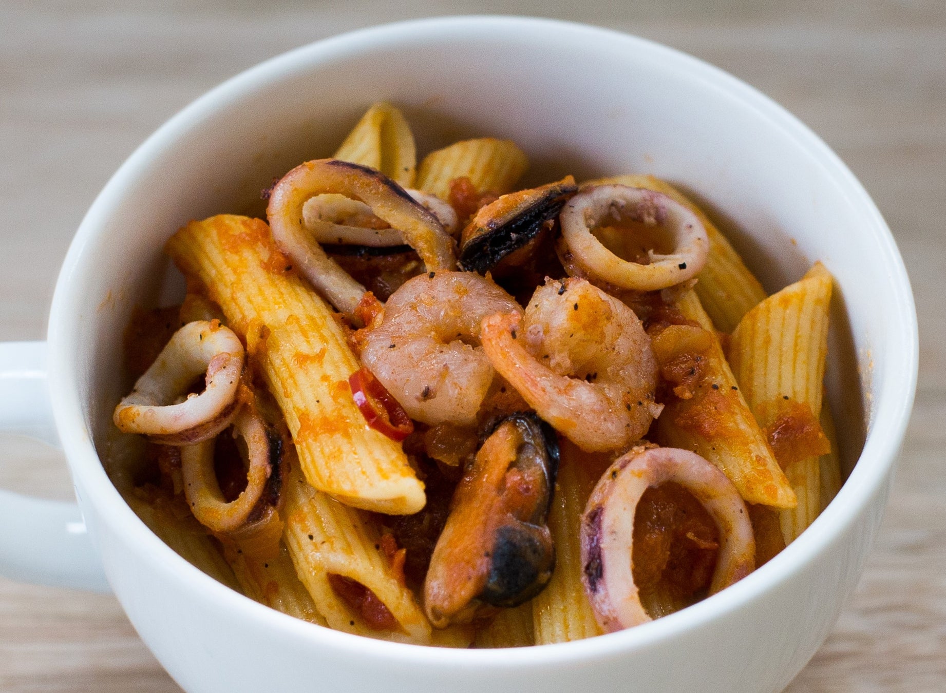 イタリア製のペンネを使用し、エビやイカなどの具材も豊富で本格的ながら食べやすい味わいです。