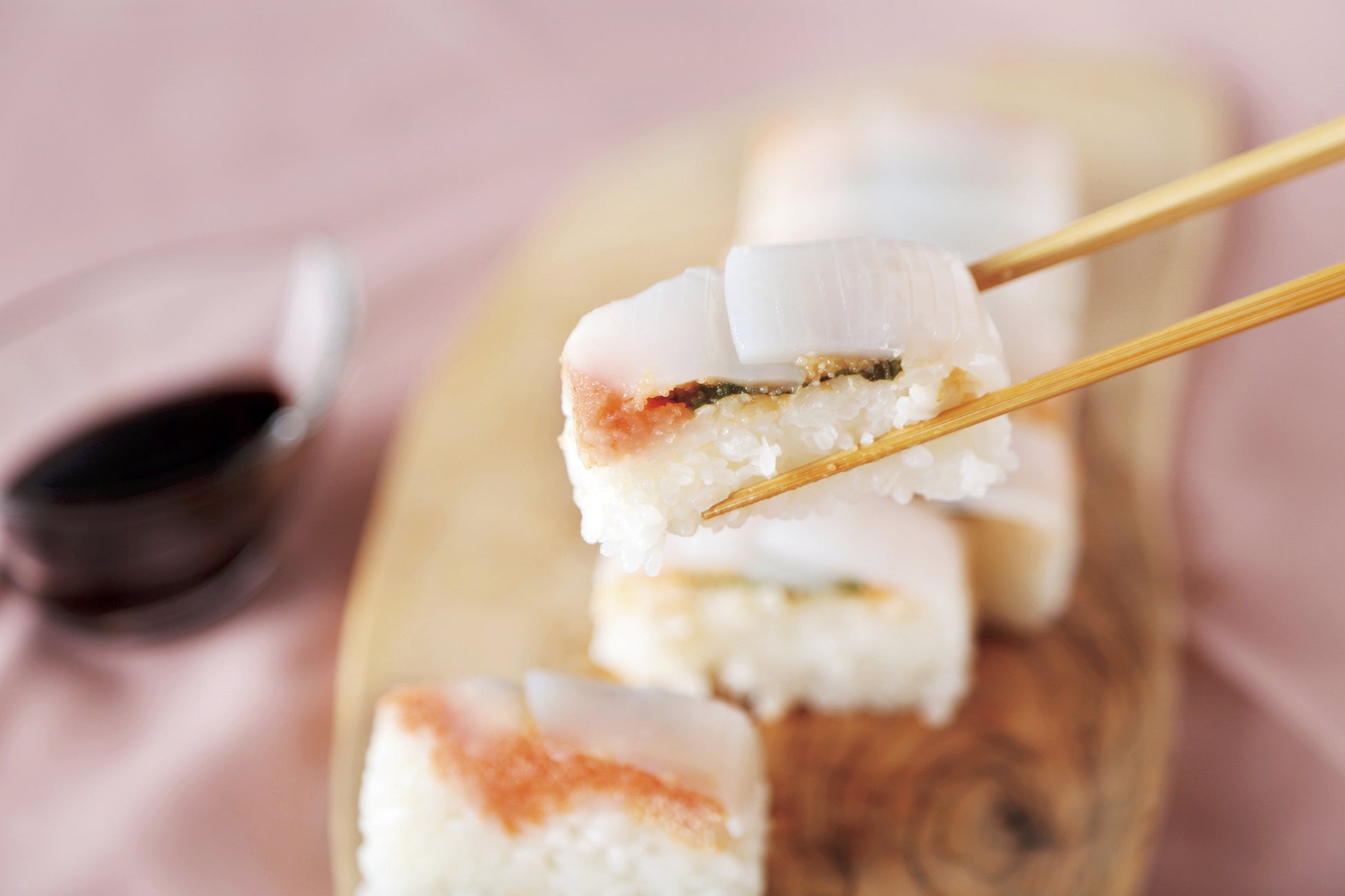 いかと酢飯の相性を考え、新たに開発した粒立ちの良い明太子を使った押し寿司です。