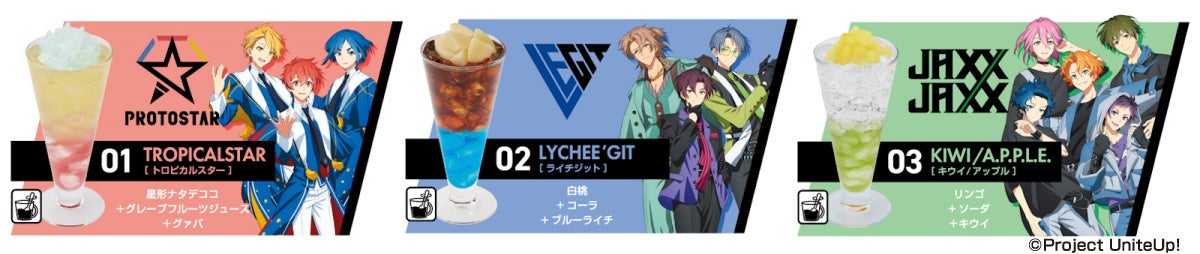 コラボドリンクは、「UniteUp! -Uni:Birth-」のユニットをイメージした全3種をご用意します。