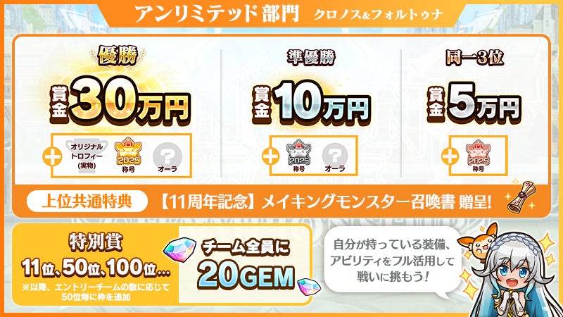 ユニゾンリーグ11周年を記念して、約4年ぶりとなる公式大会「ユニゾンリーグチャンピオンシップ 2025」を開催します。賞金総額は100万円、本大会で優勝したチームには最大現金30万円が贈られます。オンライン予選を勝ち抜き、各部門上位4チームに勝ち上がり決勝トーナメントに出場すると、この大会でしか手に入らない限定モンスターや限定装備や称号など、ゲーム内で使用できる様々な特典が獲得できます。また特別賞としてランキング上位だけでなく50位、100位など区切りの良い順位になったチームメンバー全員に20GEMが獲得できるチャンスがあります。