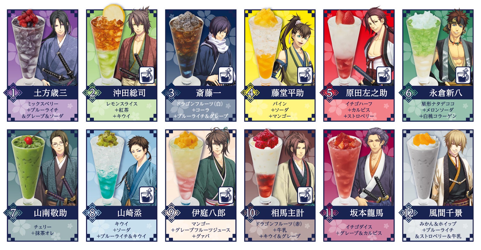 コラボドリンクは、「薄桜鬼 真改」のキャラクターをイメージした全12種をご用意します。