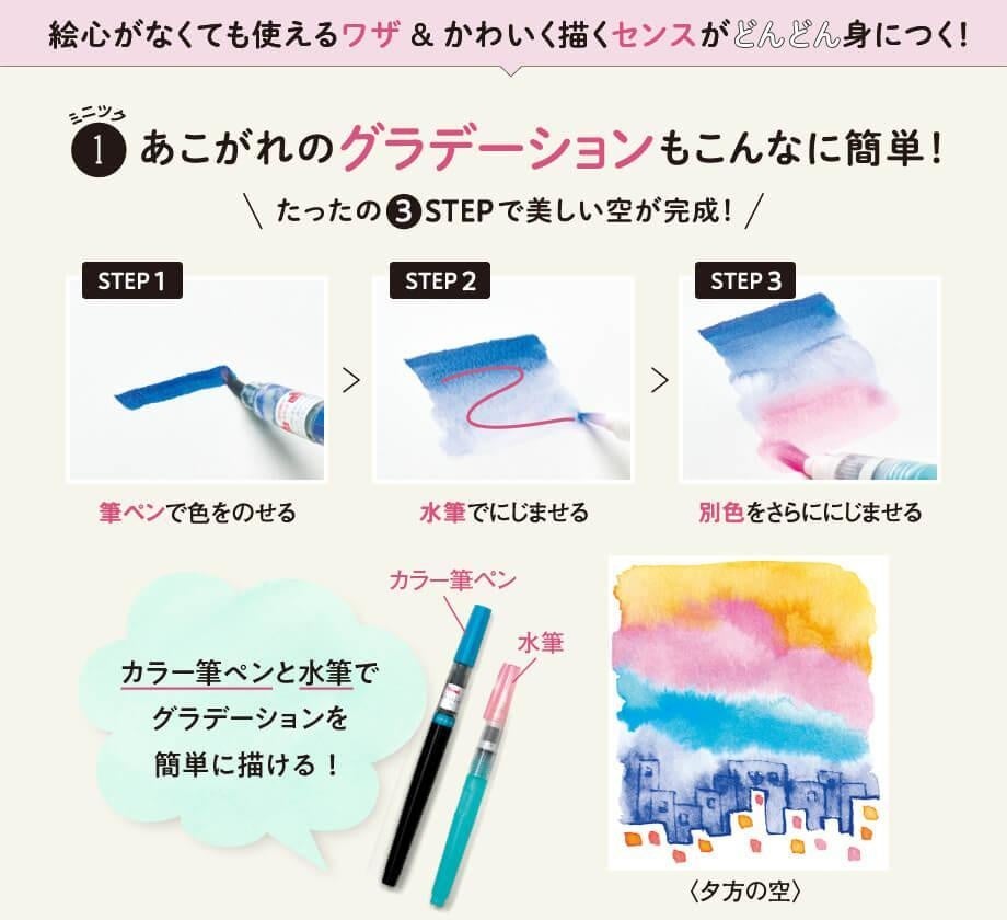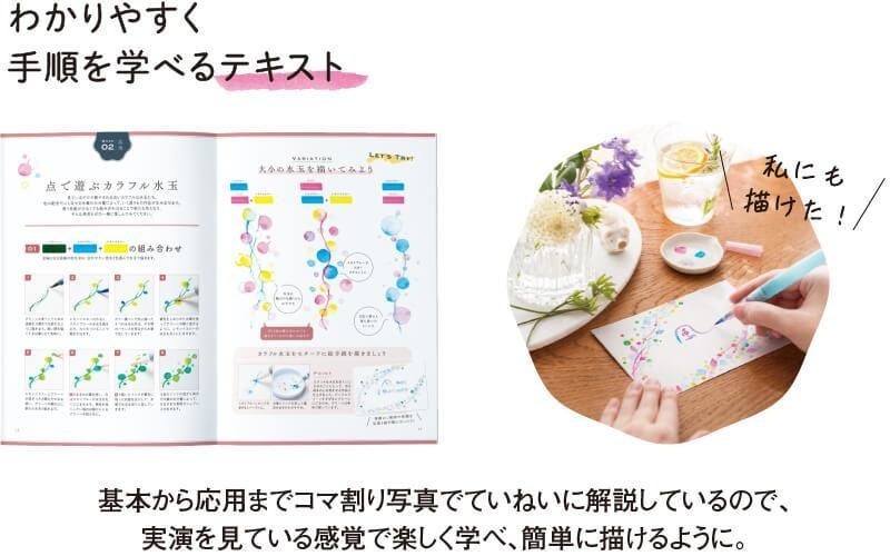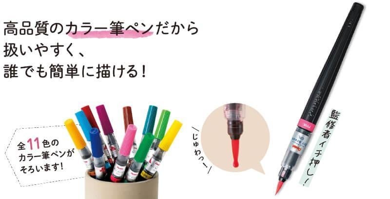 毎月届くカラー筆ペンは、ペン軸を押すとカラーインクがじゅわっと出るプッシュ式です。インクの量が調節できる毛先のしなやかな筆ペンだから、初めての人でもみずみずしい水彩表現が可能です。