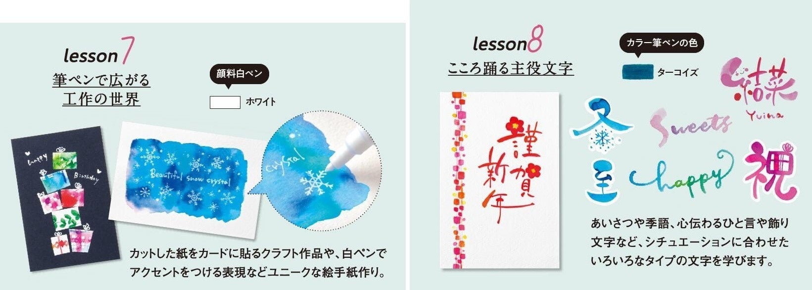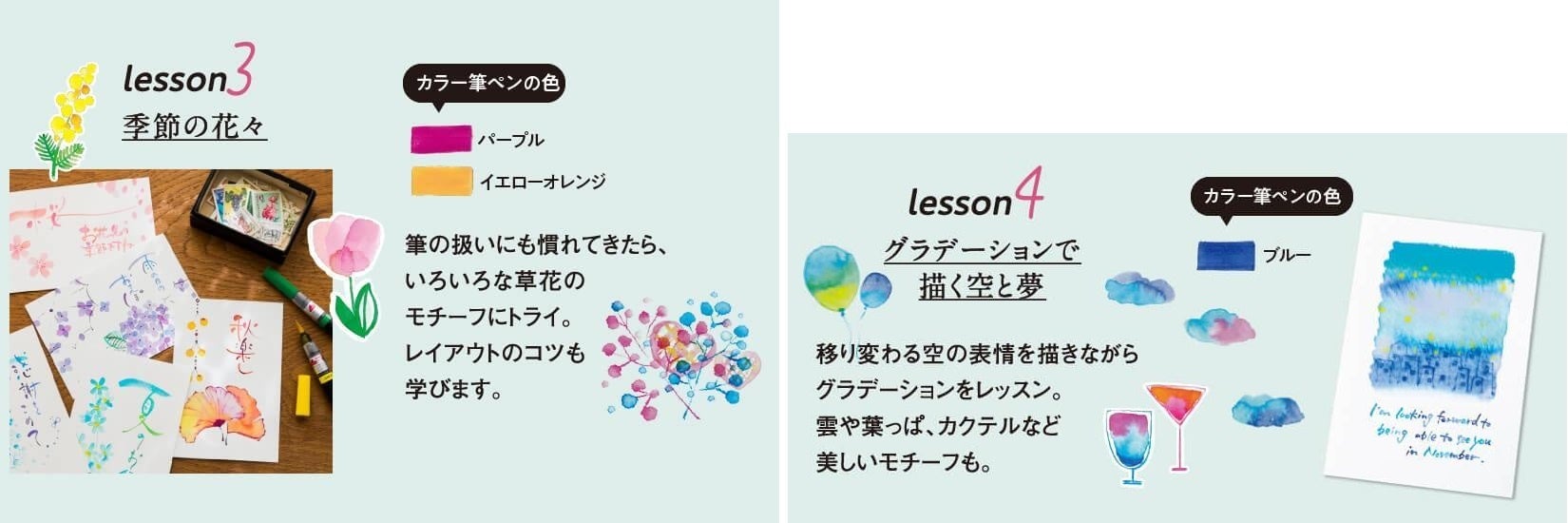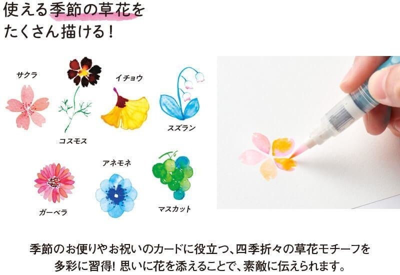 季節のお便りやお祝いのカードなどでも役に立つ、文字に添えるとパッと華やぐ四季折々の草花モチーフも習得できます。