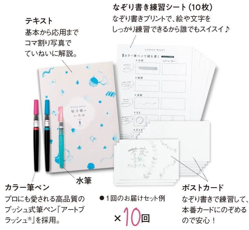 ・セット内容 / テキスト1冊(B5判 16ページ)、カラー筆ペン2本(お届けする回により異なります)、なぞり書き練習シート10枚(B5判)、ポストカード9枚(10×14.8cm)、水筆1本(1ヵ月目と5ヵ月目お届け)など