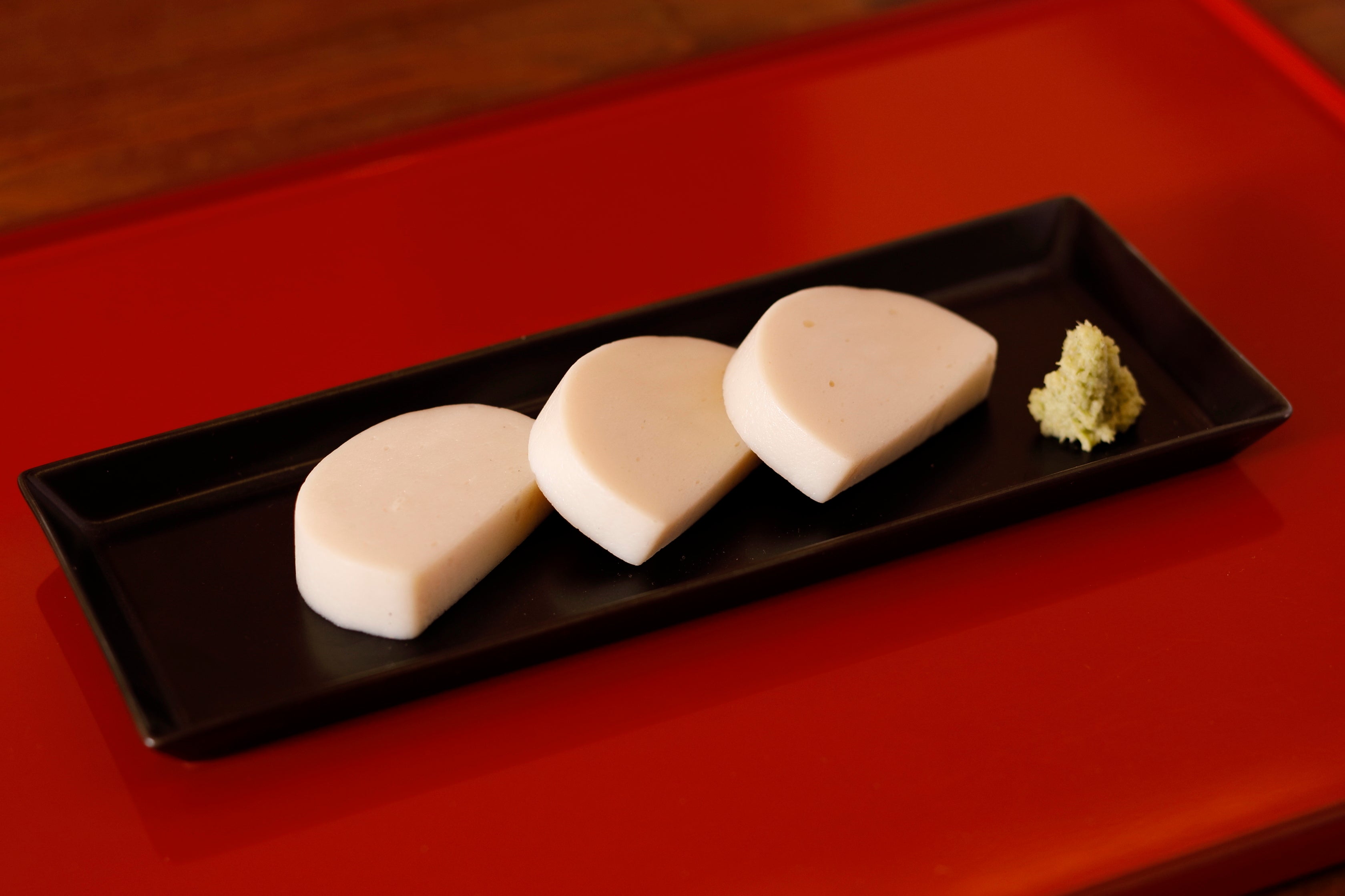 メイン料理前の、そば前として人気のメニュー。日本酒とも相性抜群で、プリっとした歯ごたえのある厚み、滑らかなのどごしが特徴の小田原産のかまぼこを採用。控えめながらしっかりとした魚の旨味を感じることができる人気の「板わさ」です。