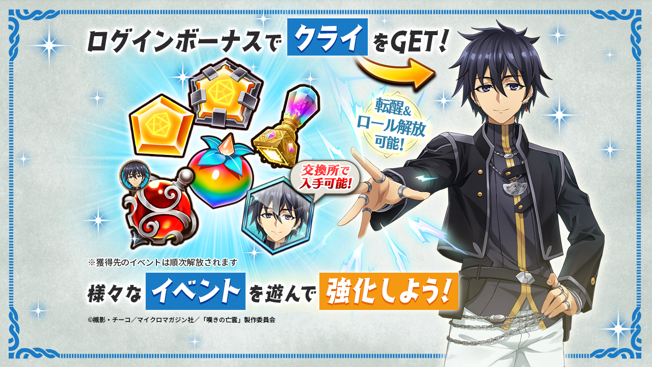 コラボ期間中の初回ログインで「クライ」がもらえます。また、コラボイベントでは、コインを集めて交換所でクライの育成アイテムなどと交換可能で、そのほか様々なイベントからクライの育成アイテムを入手することができます。また、「クライ」を「転醒」させると、見た目やスキルモーション、能力が変化し、ステータスも大幅に上昇します。