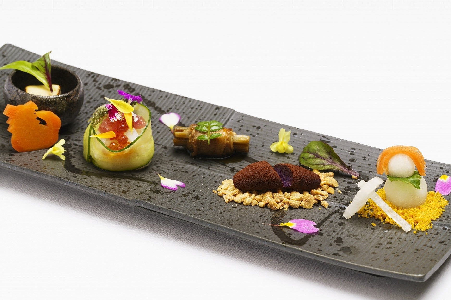 チーズの王朝味噌漬けや紅芋、キジムナーをイメージした唐墨大根、薪をイメージした島豚八幡巻で、キジムナーとシーサーの出会いを表現しました。