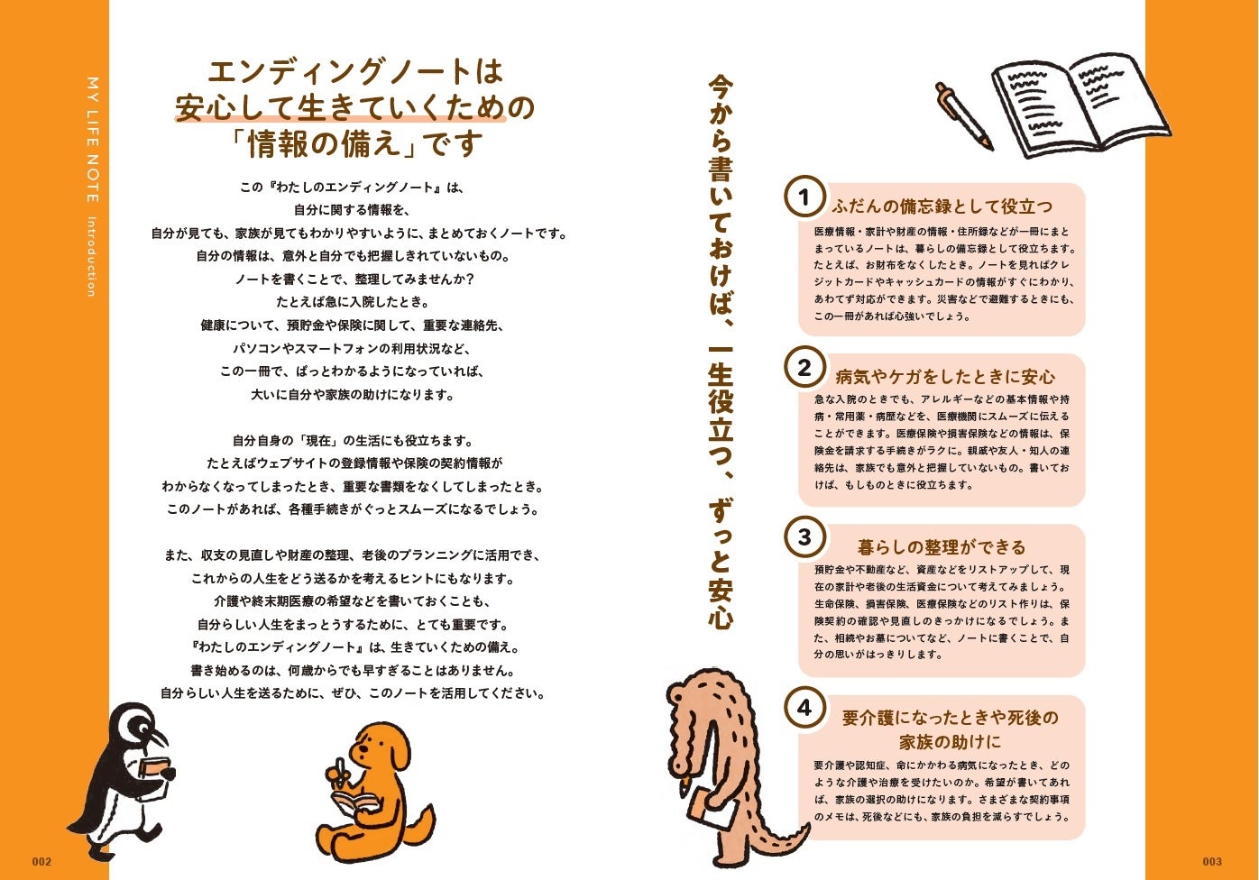 「親御さんが記入を嫌がったり、1人で書くのが難しかったりする場合、お子さんが『私も書くから一緒に書こう』と水をむけ、思い出話をしながら書くといいでしょう」。『一番使える わたしのエンディングノート』は、ユーモラスな動物のイラスト入りの明るいデザインで、日記気分で書け、家族にすすめやすいのもポイントです。ボールペンでもシャープペンシルでも書きやすく、消してもけば立ちにくい紙を採用、元気なうちから書き始め、更新しながら長く使っていける仕様になっています。