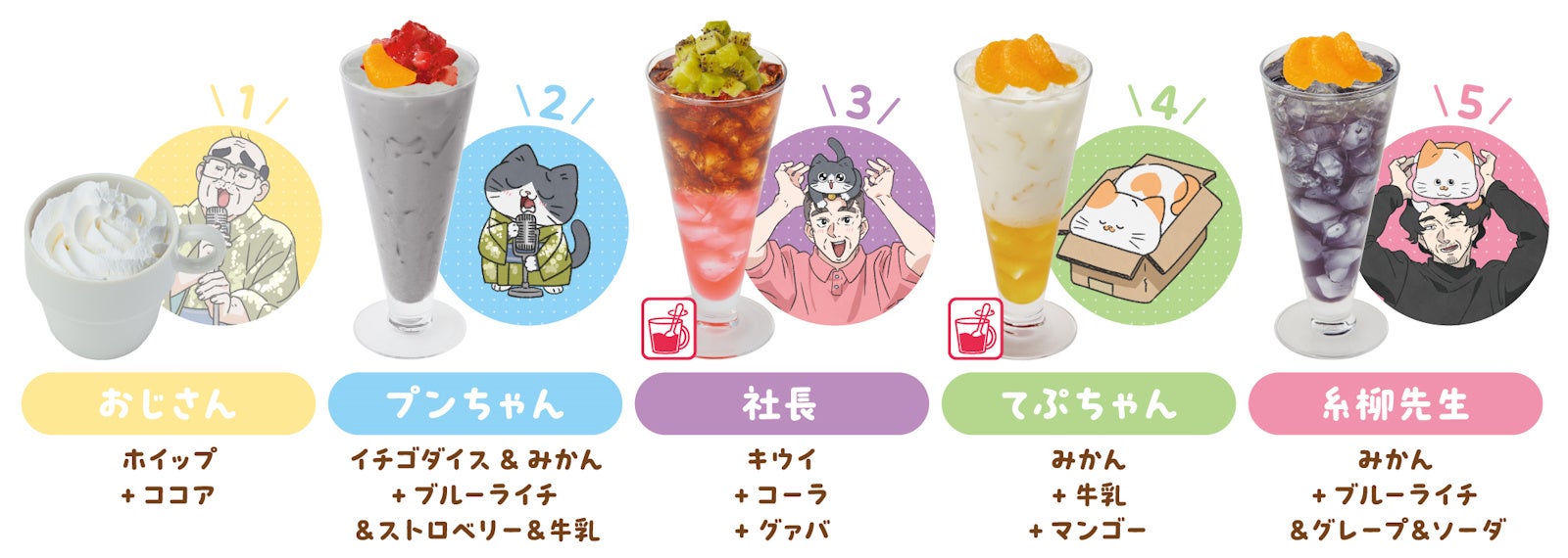 コラボドリンクは、「ねこに転生したおじさん」のキャラクター「おじさん」「プンちゃん」「社長」「てぷちゃん」「糸柳先生」をイメージした全5種【各750円(税込)】をご用意します。注文特典として、オリジナルポストカード【全40種:第1弾20種/第2弾20種】の中から、コラボドリンク1品ご注文につき1枚プレゼント!