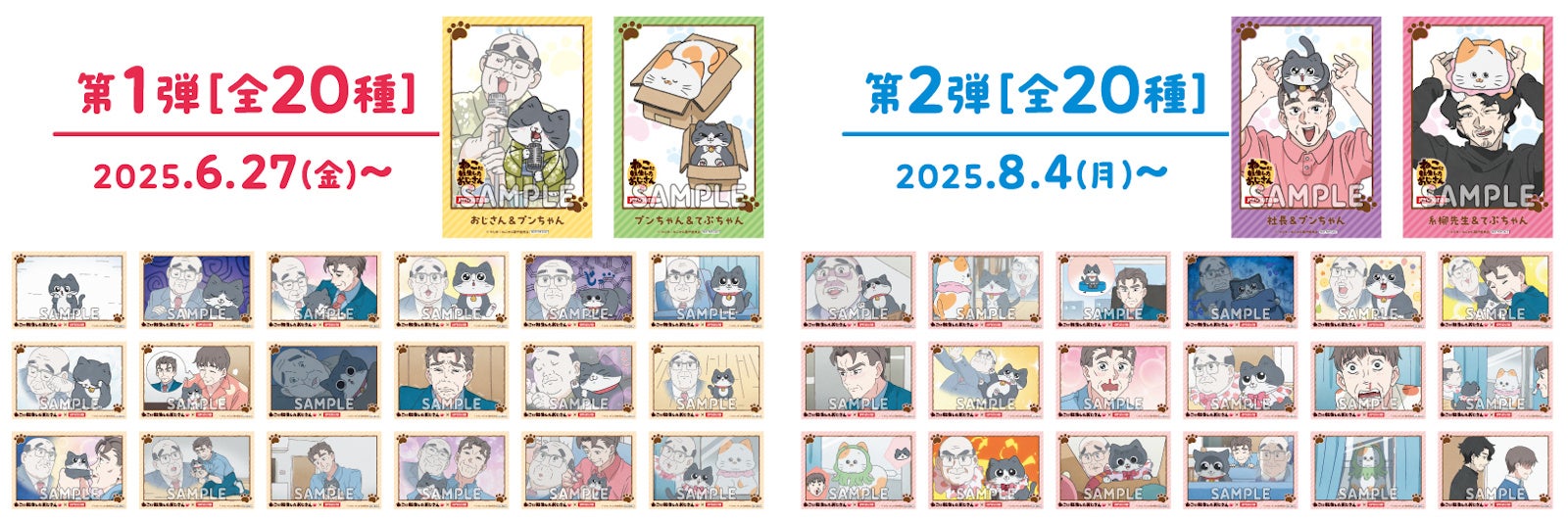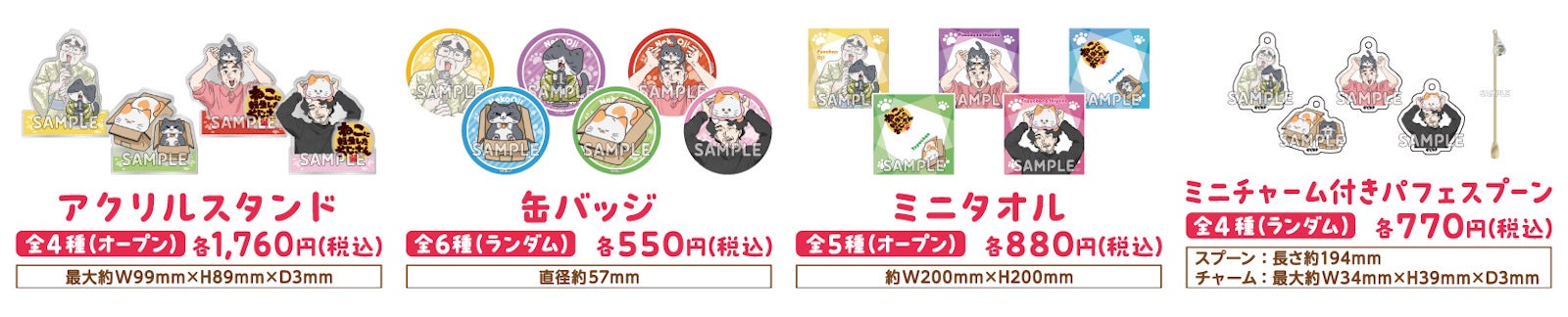 「ねこに転生したおじさん」のキャラクター「おじさん」「プンちゃん」「社長」「てぷちゃん」「糸柳先生」をイメージした全5種【各750円(税込)】をご用意します。