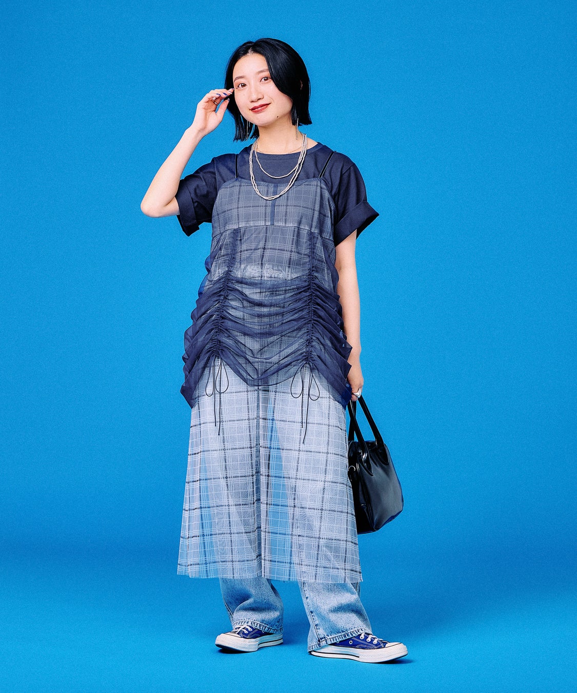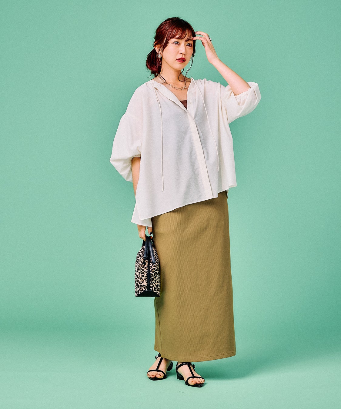 着痩せコーディネートが得意な「しゅり」は、ロゴTシャツとチュールスカートのセットアイテムを企画。 ぽっちゃり体型の方にもきれいにフィットすることを念頭に、シルエットや仕様に気を遣いながら、女性らしいディテールでまとめています。