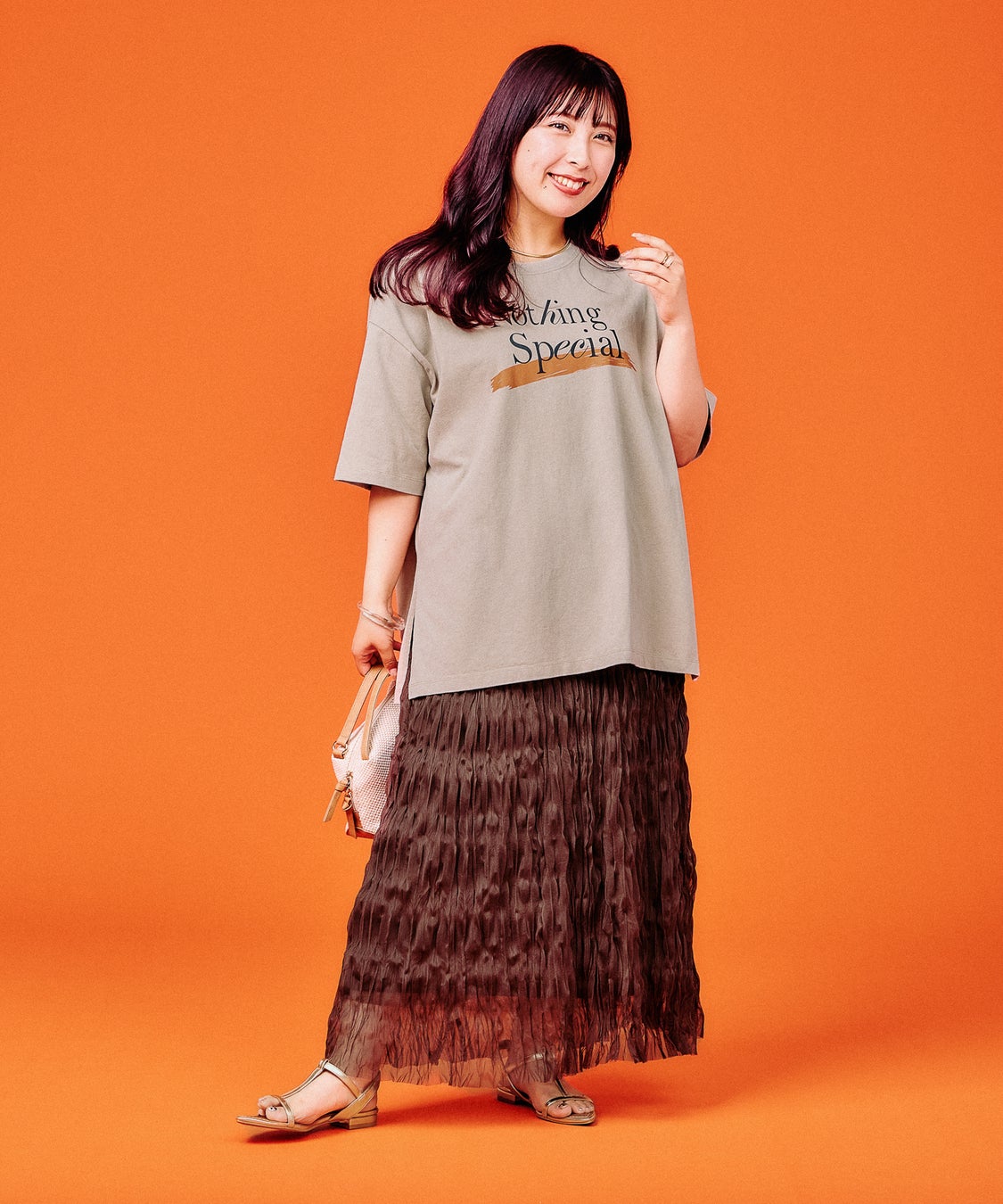 ロゴTシャツは、体型カバーができるようにオーバーシルエットに設計。首元の開き具合や裾のスリットで女性らしさも表現しています。肘までが隠れる袖丈で手首を出すことで腕をスッキリと見せられます。ヴィンテージ加工を施し、大人にも着やすく仕上げています。スカートは立体感のあるウェーブチュール素材で、ボディラインを拾わないデザインです。ウエストには柔らかく太めのゴムを採用し、食い込みにくい仕様にしました。