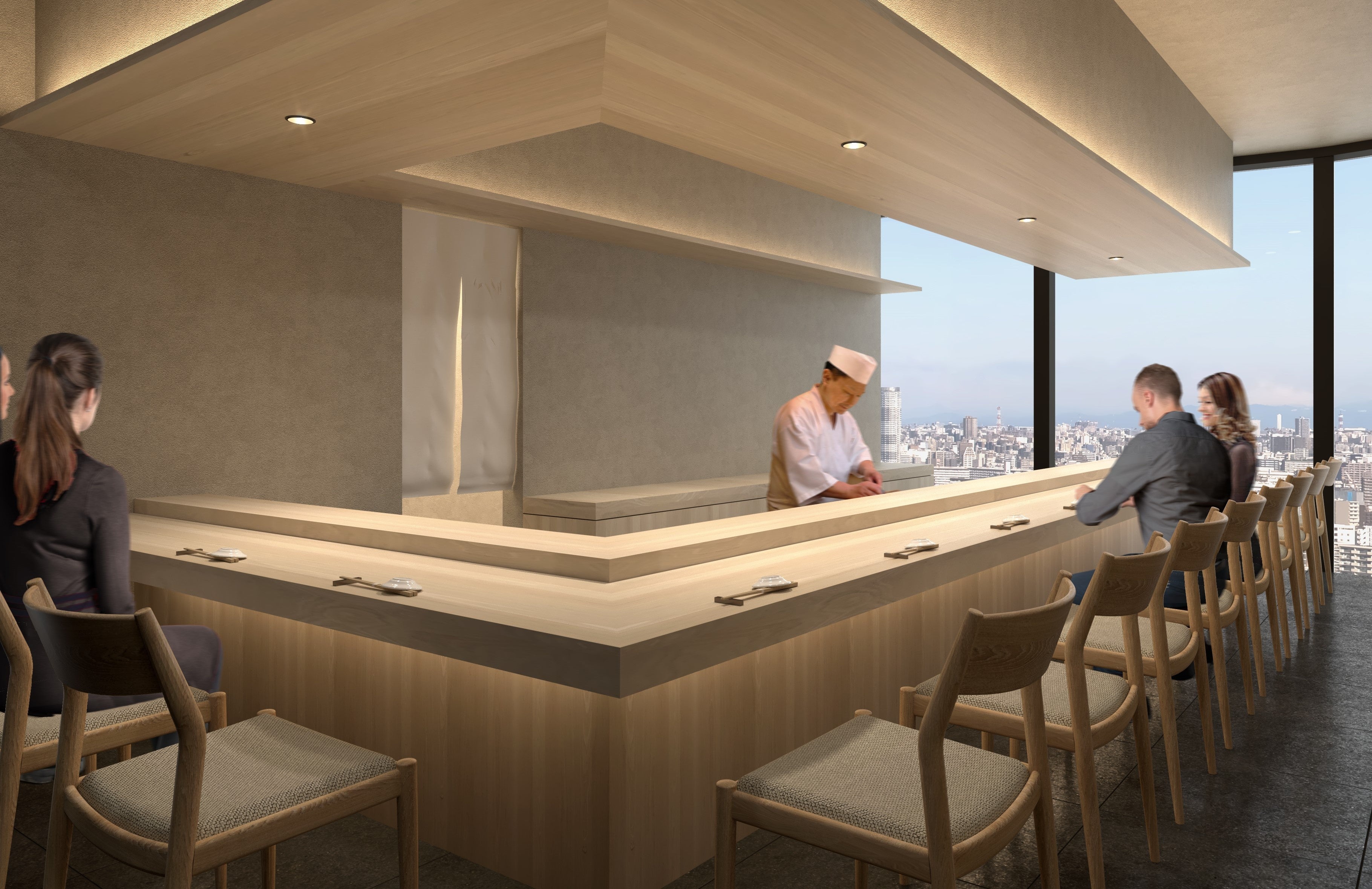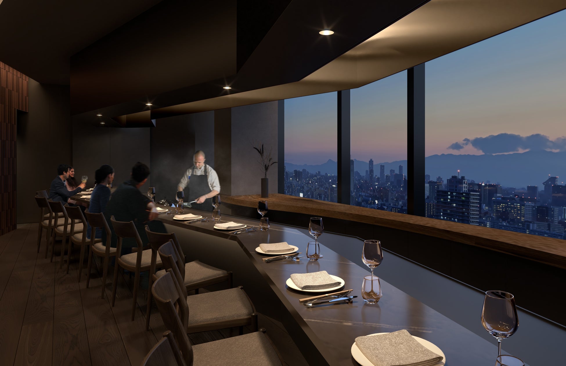 シェフの熟練した技と季節ごとに移り変わる旬食材の巡り合わせにより、幸福なときを過ごしていただきたいという想いを込めました。選び抜いた和牛をはじめ、日本各地の厳選食材を目の前で仕上げます。壮大な景観が広がるカウンター席は、シェフとの会話を楽しみながら各席のプライベートが保たれるように配慮されています。