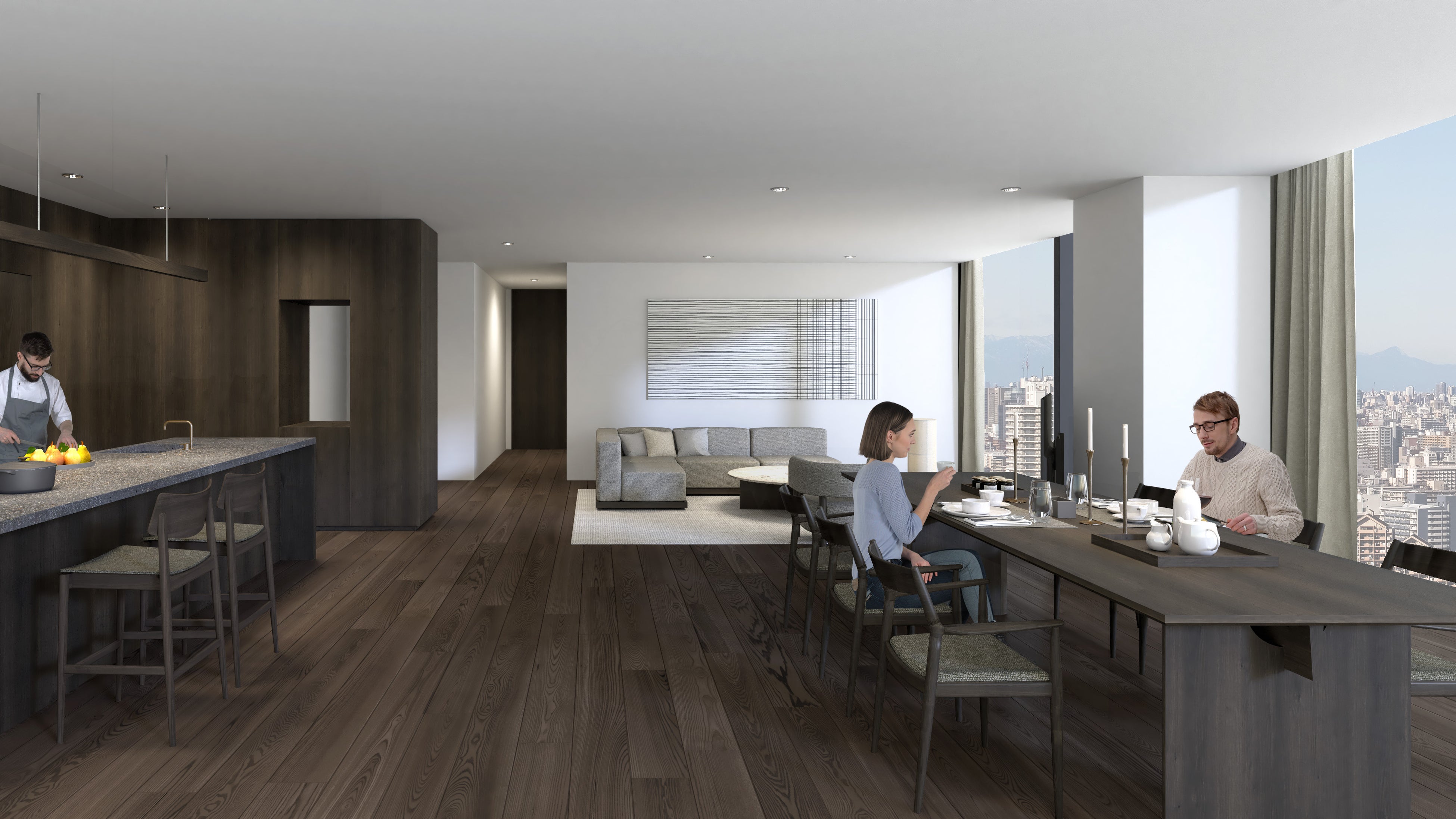 45階から47階に位置するペントハウスは、別荘や邸宅を貸し切ったような特別な感覚でお過ごしいただける「天空のプライベートヴィラ」の拠点。全室にキッチンを備え、プライベートレストランとしてのリクエストに応え、滞在を細やかにサポートするバトラーが特別なプライベート時間をお約束します。ペントハウス・ダイニング・スパを合わせたホテル最上部の空間デザインは、話題のレストラン、カフェ、セレブリティのための住宅設計で定評のある芦沢啓治氏※2がインテリアデザインを手がけ、デザインパートナーにNorm Architects※3が参画しました。歌舞伎町の世界観を強く反映し、まちとつながる下層階から上層階に向かうに従い都会の喧騒から離れ落ち着いた気配が濃度を増し、空に溶け込んでゆくような天空の世界へと誘う、日常から解放された透明感、無の世界を表現しました。