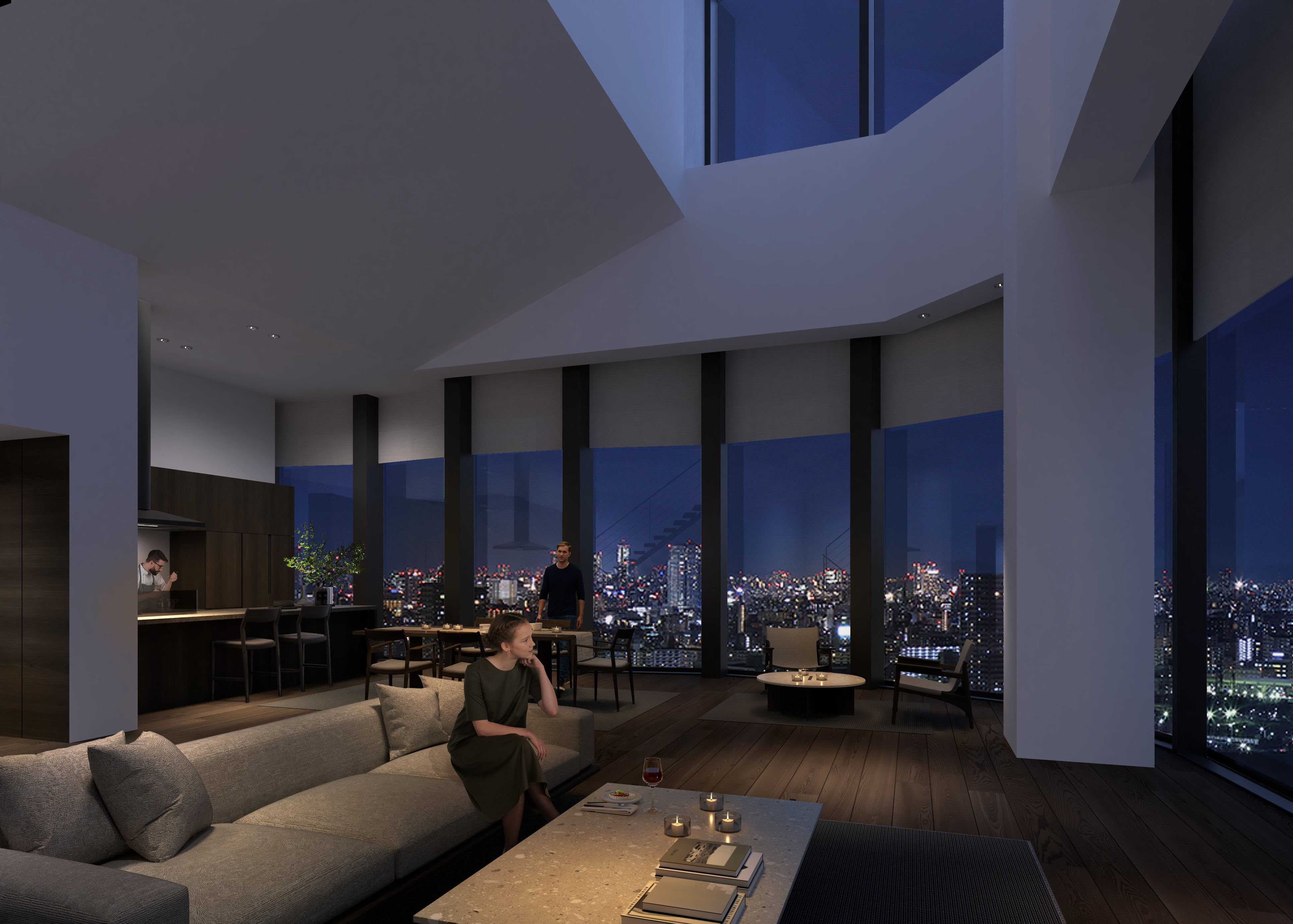 天空のプライベート空間に降り立ったゲストの安らぎを約束する2層吹き抜けの開放感あふれる空間。