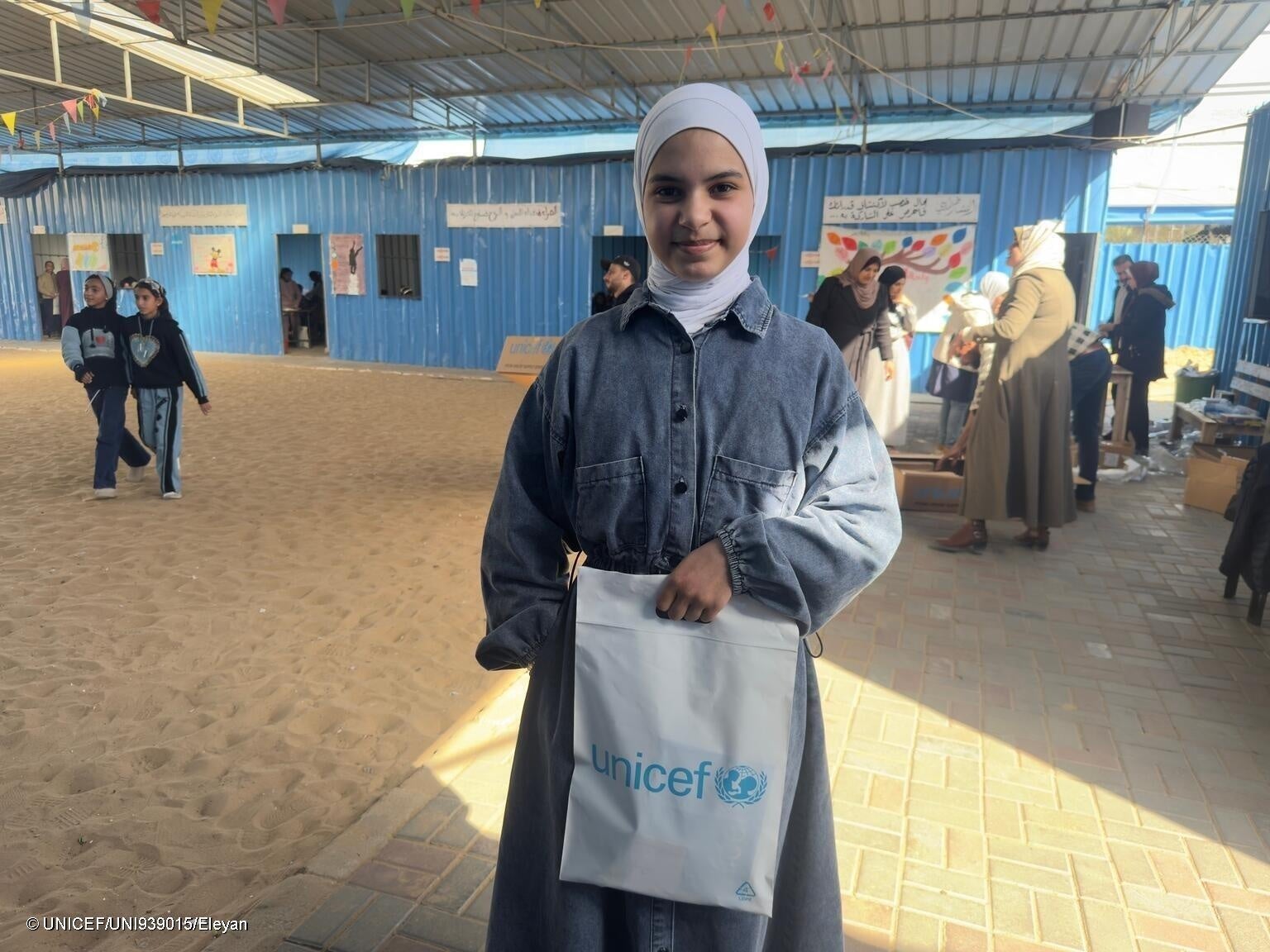 3週間前、ガザ地区のデルバラハにあるユニセフの仮設学習センターで、15歳の女の子ハラさんに会いました。彼女はこう語りました。「学校に行けないことで、勉強にとても大きな影響が出ました。教育は私の未来にとって大事なので、安全な生活を夢見ています。安心して暮らせる家、自分の部屋、そして、学んで成長できる良い学校が欲しいです」。