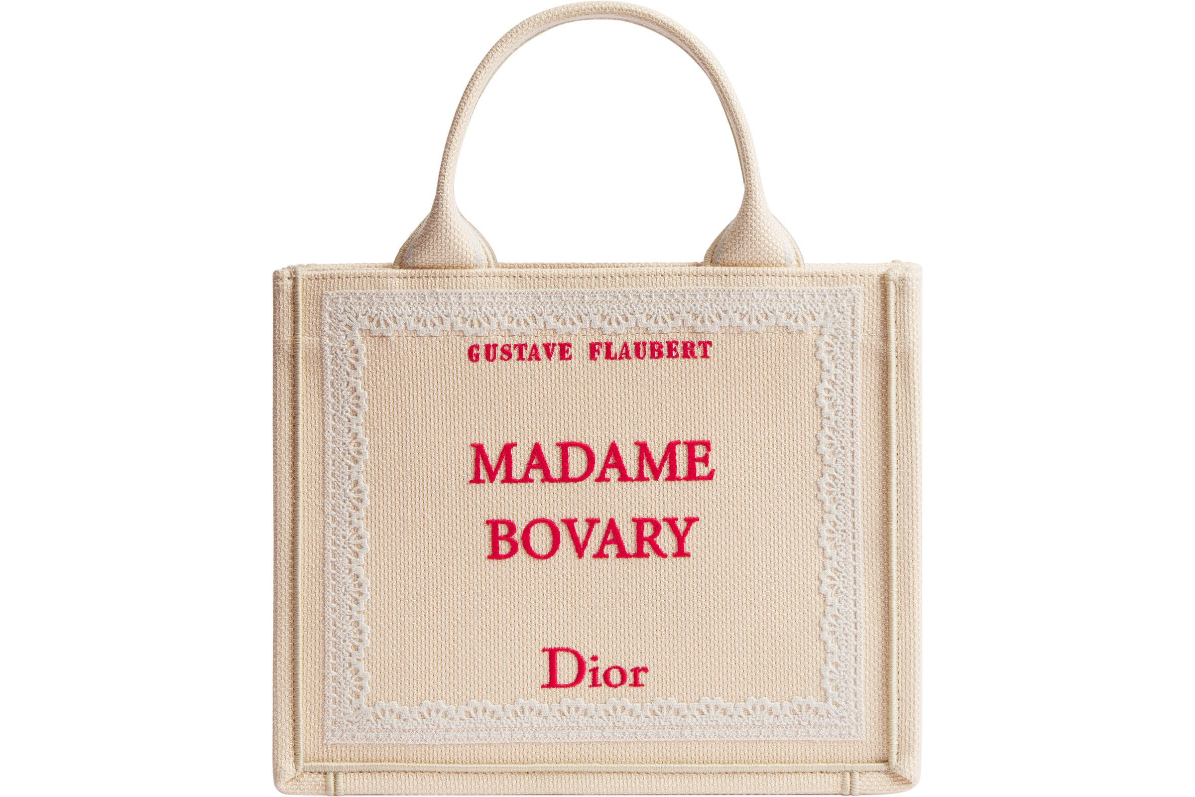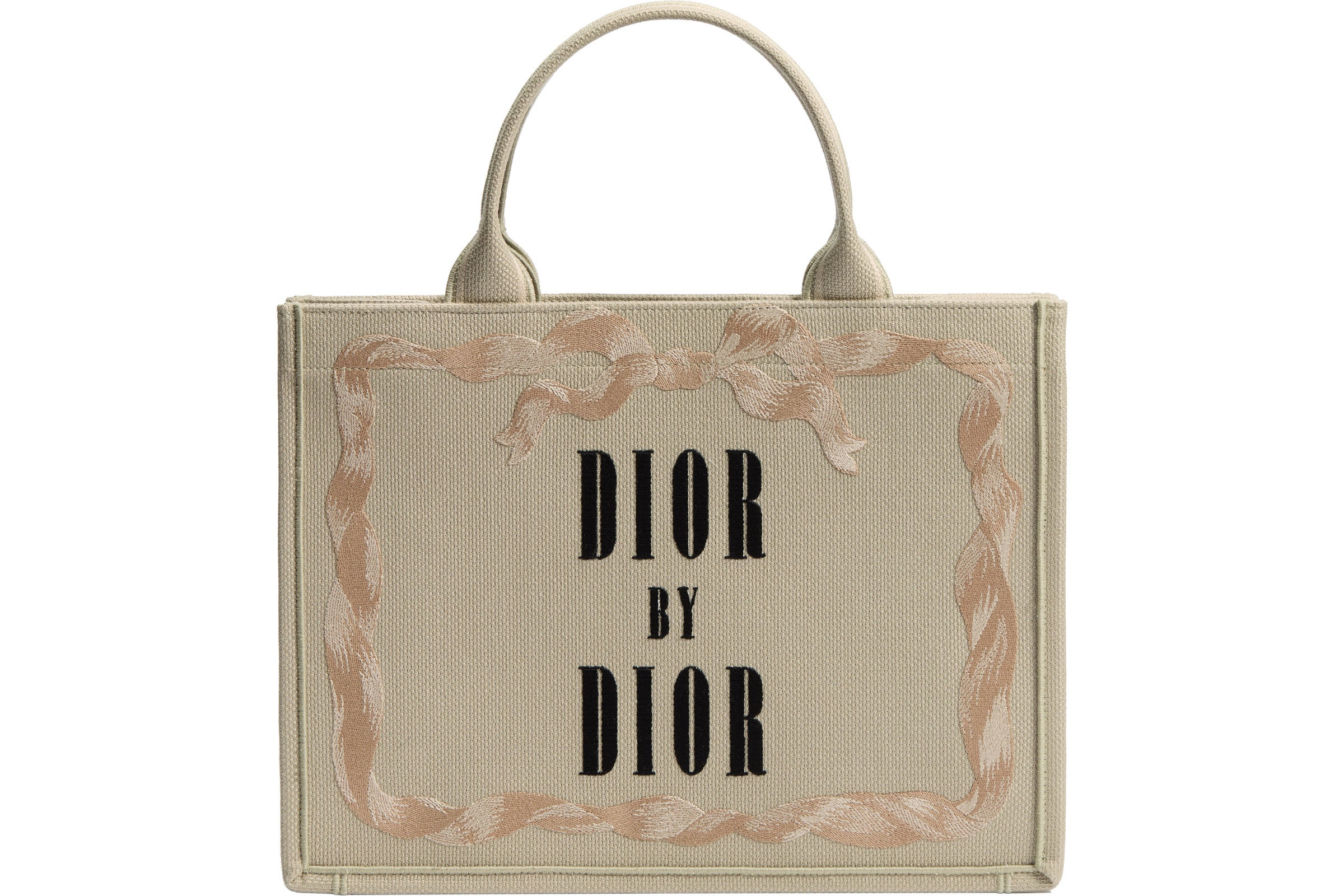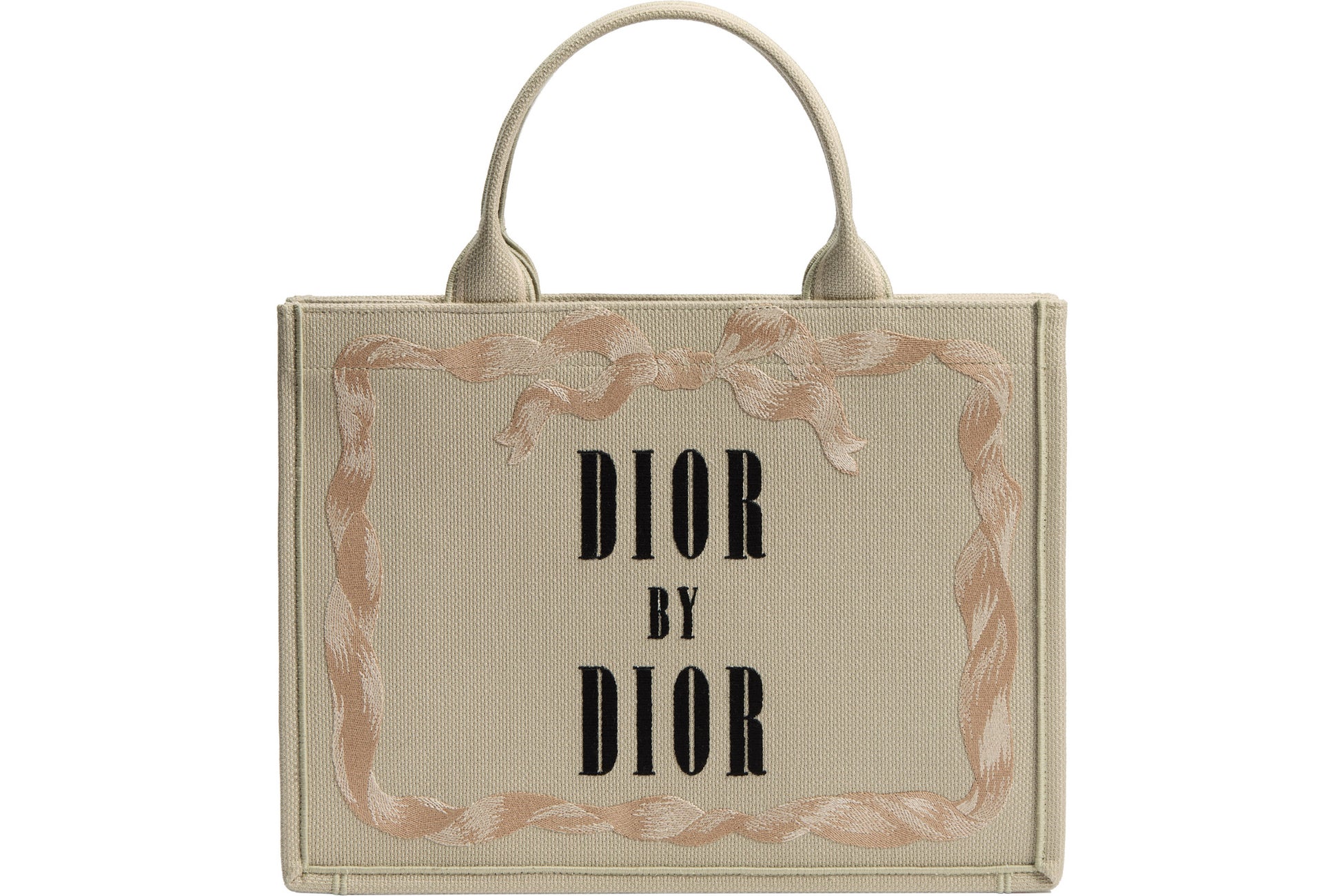 メゾンのモダンなアイコンである「ディオール ブックトート」には、シーズンごとに新たな解釈が加えられてきました。ジョナサン・アンダーソンによってデザインされた新しいモデルの一つは、ムッシュ ディオールの自伝である書籍『Dior by Dior』の表紙がデザインに落とし込まれ、クリームの色合いで登場し、繊細なピンクのリボンで飾られた象徴的なタイトルが刺繍で表現されています。