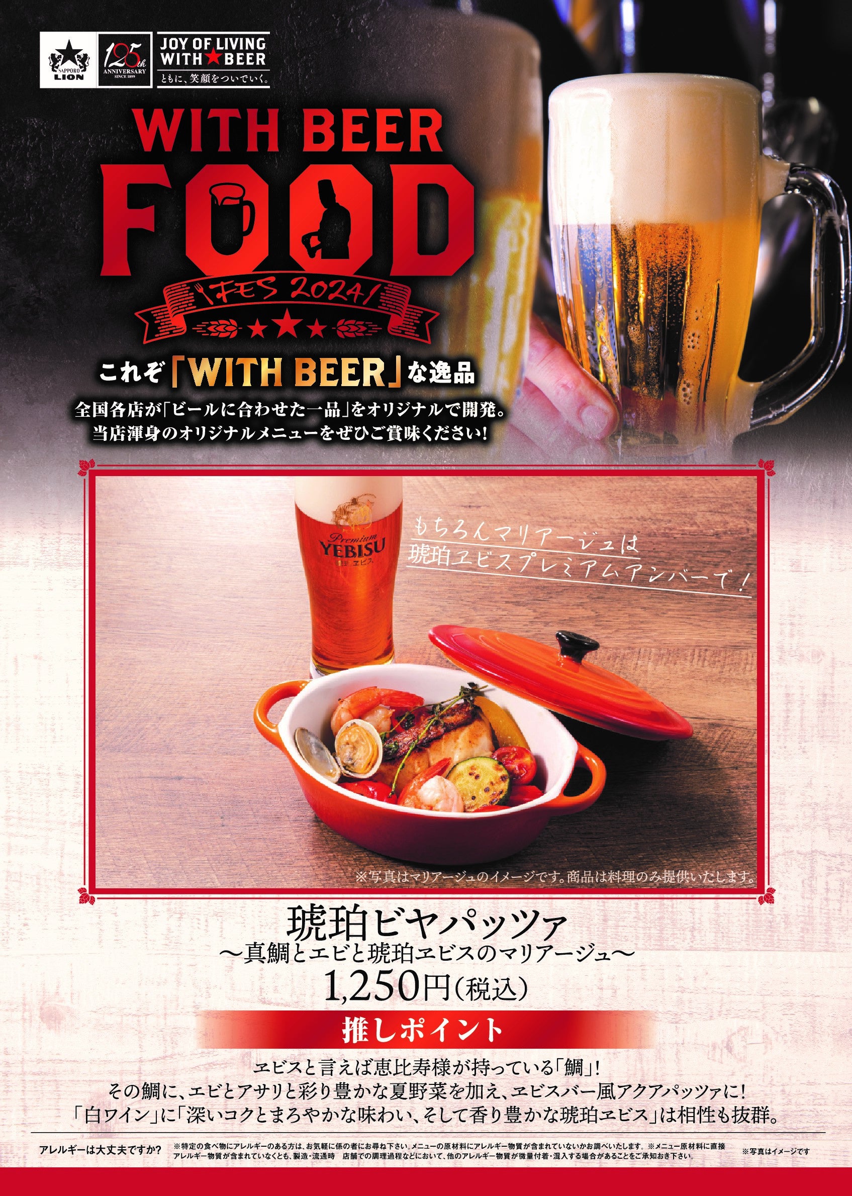 全国各店が“WITH BEER”、すなわち“ビールに合う一品”をテーマに考案したオリジナルメニューを、一律1,250円(税込)で期間限定販売します。